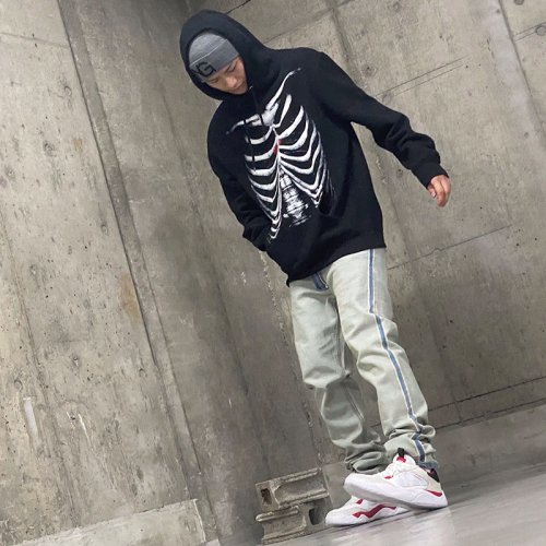セルヴィッジデニムを裏返して縫製した遊び心あるデニムパンツ。スーパースリムなシルエットでストレッチが効いているので穿き心地も抜群。股下が長いスタックスキニースタイル。ストリートコーデにアクセントを加えてくれる一本。