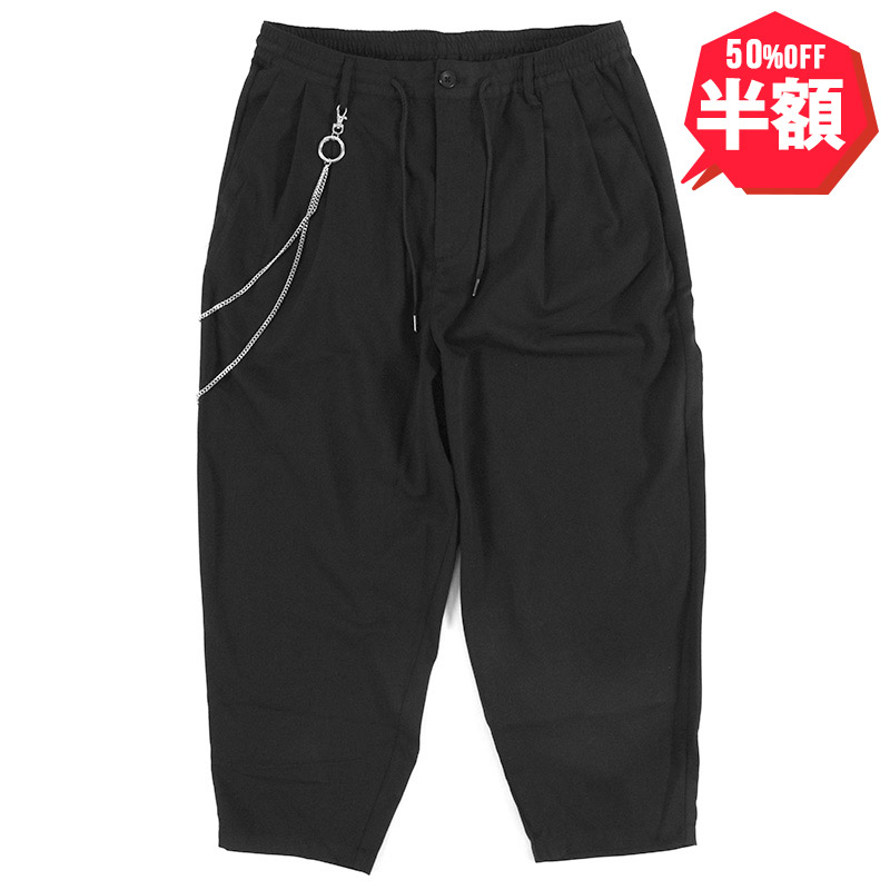 着脱可能なチェーンがスタイリングのアクセントになったイージーパンツ。ウェストゴム仕様で裾にかけてすっきりとしたシルエットでリラックスして着用できる一本。