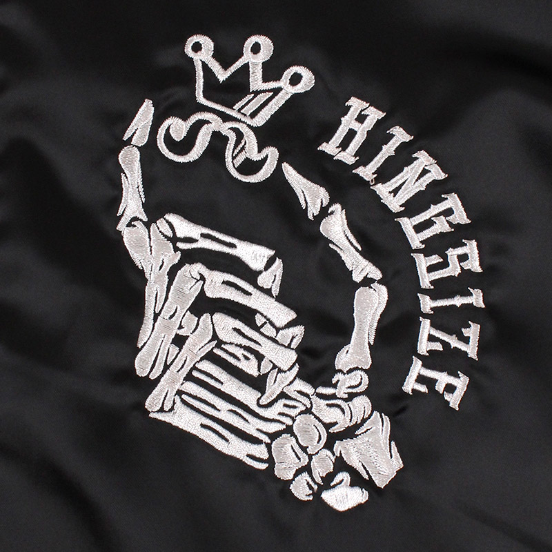 光沢感のあるサテン生地を使用したスカジャン。表面はフロントにブランドネームとHiGEロゴをハードにデザイン、バックにはB.A.D.な女神を高品質な刺繍でオン。裏面はブラックボディにスリーブカラーを切り替えしたオーソドックスな仕上がりでフロント、バック共にBONEデザインを刺繍しました。迫力あるグラフィックながら単色刺繍でスタイリングしやすい一着。全方位抜かりなく、その日の気分によって、楽しめる秀逸アイテム。どちらで着用するかは、あなた次第です。