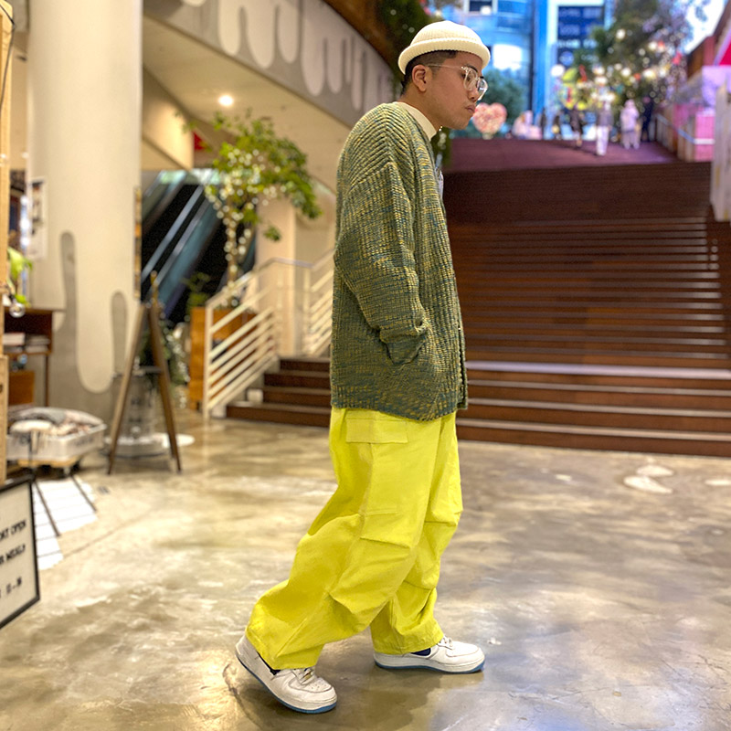 ビーニーとインナーをオフホワイトにすることで主張の強い上下のカラーを中和しました。