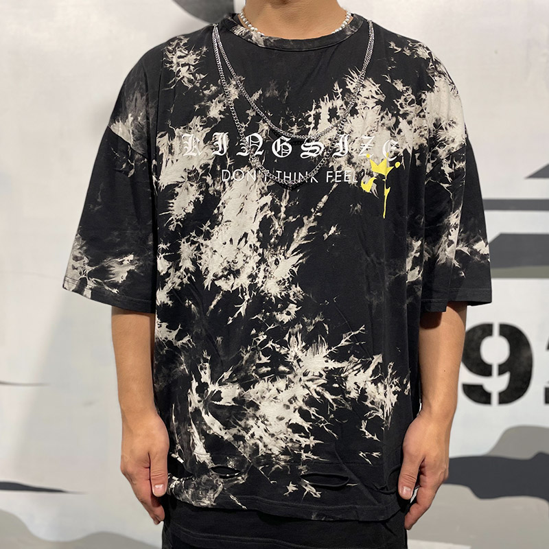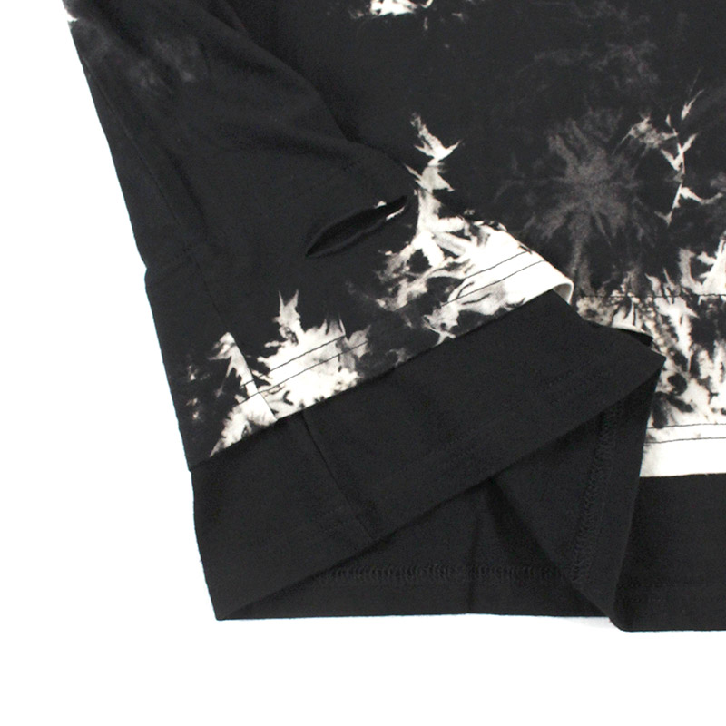 フロントにオールドイングリッシュロゴにドリップHiGEロゴをオーバープリント。首元のシルバーチェーンは着脱可能で、その日の気分でスタイリングできる一枚。タイダイ素材の裾部分にはダメージ加工を施し、ブラック生地との重ね着風のフェイクレイヤード仕様となっています。ゆったりとしたオーバーサイズなシルエットで、サマーシーズンに大活躍する主役級アイテム。