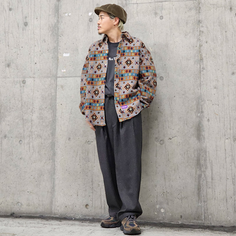 インナー、パンツはダークトーンで統一する事でインパクト抜群なPeetee.のレトロシャツが更に際立ってみえるのもポイント◎