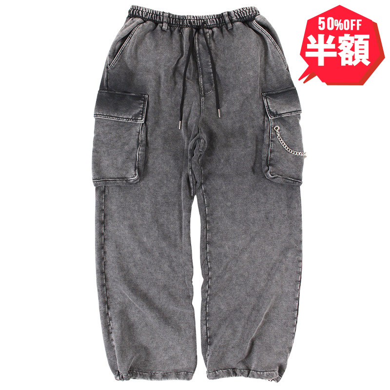 古着のような風合いを出すためのケミカルウォッシュとダメージ加工を施したスウェットカーゴパンツ。