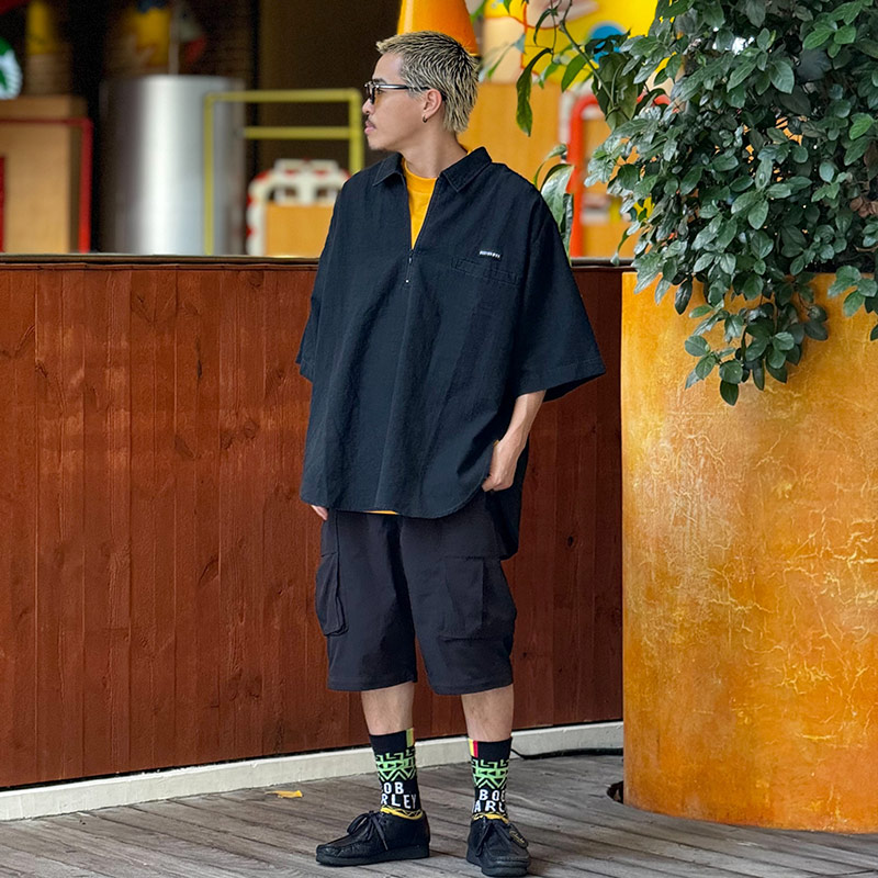 BUDSのハーフジップシャツは、通気性と着心地が抜群で、立体的なシルエットが特徴的◎ 大きめのアールが入ったスリットがポイントで、インナーとの組み合わせも楽しむことができます。KINGSIZEのカーゴパンツは、ロングパンツとしても使用可能で膝部分がジップで取り外せ、季節を問わず活躍するアイテム♪ラガなアクセントとしてボブ・マーリーのソックスをプラス!さりげなくレゲエ好きを感じさせるコーデ♪