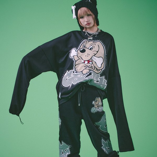 フロントにラインストーンで縁取ったおなじみのワンちゃんを大きくオンしたロンTee。身幅を大きく取ったビッグシルエットに超ロングな袖がインパクト抜群です。さらりとした風合いの素材でリラックスして着用でき、袖部分のドローコードでシルエット調節可能。GALFYらしさあふれる大胆で遊び心あるアイテム。様々なスタイリングを楽しめる女性にもおすすめのユニセックスアイテムになります。