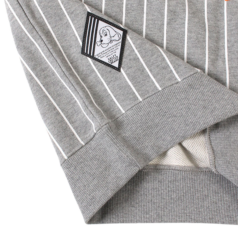 ピンストライプの裏パイルのスウェット素材を使用したアクティブな雰囲気のクルーネック。フロントにはヘルメットを被ったおなじみのワンちゃん。バックには背番号をデザインしました。ゆったりとしたシルエットが特徴的なユニセックスでおすすめのアイテムです。