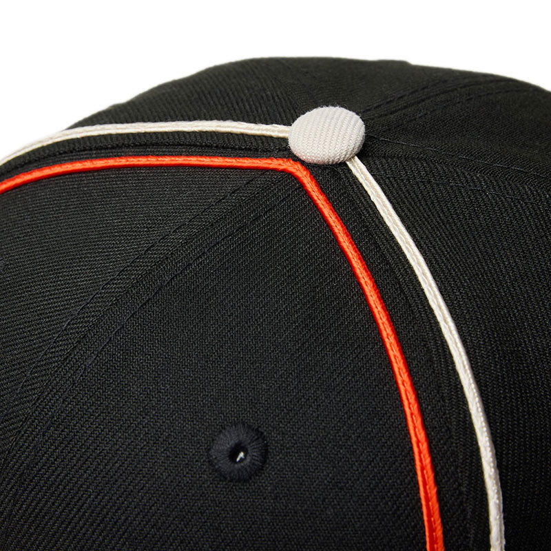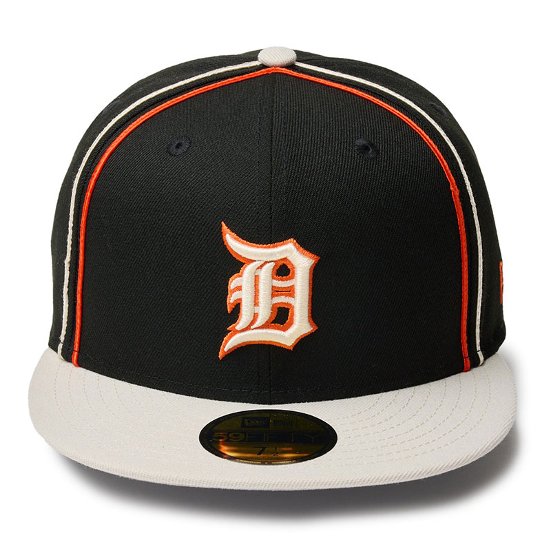 ブラックボディにオレンジとアイボリーのテーピングがアクセントになったデトロイト・タイガースモデルのキャップ。シルエットはニューエラを代表するスタイルの59FIFTY。バイザーはストーンカラー、アンダーバイザーはグレーで配色。フロントパネルの内側に独自の芯を作ることで型崩れしにくいクラシックなシルエット。