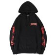 バックにJUMBO MAATCHとfeaturingのVIGORMAN, CHEHON & NG HEADをスモーキーにデザインした裏パイル地のフーディー。両袖には血塗られたマチェーテをオン!!デザインワークはもちろんKOTETSU氏!12.7オンスのヘビーウェイトな裏パイル地を使用したさらりとした風合いでリラックスして着用できる一枚。アーバンテイストでデイリーに着回しができる、ややざっくりなシルエットが特徴的。通年着回しの効くコットンの裏パイル素材でデイリーのメイントップスとしても最適です。
