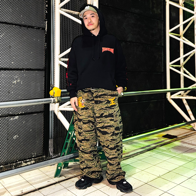 インパクト抜群の “STAY REMIX HOODY” を主役にパンツはタイガーカモ柄の6ポケットカーゴパンツをチョイス!
