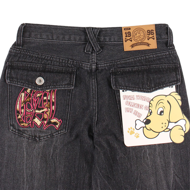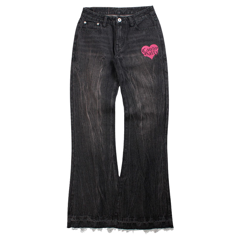 ヴィンテージ加工を施したフレアシルエットのローライズデニム。フロントには「Candy Galy」の刺繍が入り、さりげないアクセントをプラス。バックポケットには、ポップなロゴデザインと、キュートなワンちゃんをオン!オリジナリティある仕上がり。ダメージ加工や裾のカットオフ仕様がこなれ感を演出し、ストリートやカジュアルなコーディネートにぴったりの一本です。
