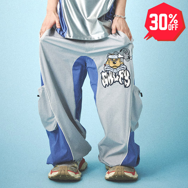 フロントにおなじみワンちゃんをデザイン、バックにGALFYのロゴデザインを配置した存在感抜群のナイロン素材のワイドパンツ。両サイドに機能的なカーゴポケット付き。裾部分にはドローコードが付いており、シルエットの調整が可能。ウエストはゴム仕様で、着脱しやすく、裏地メッシュで快適な着用感の一本。ゆったりとしたサイジングでストリートスタイルに大活躍間違いの女性にもおすすめのユニセックスアイテム。同デザインのTシャツとのコーディネートもオススメです。