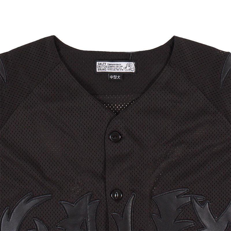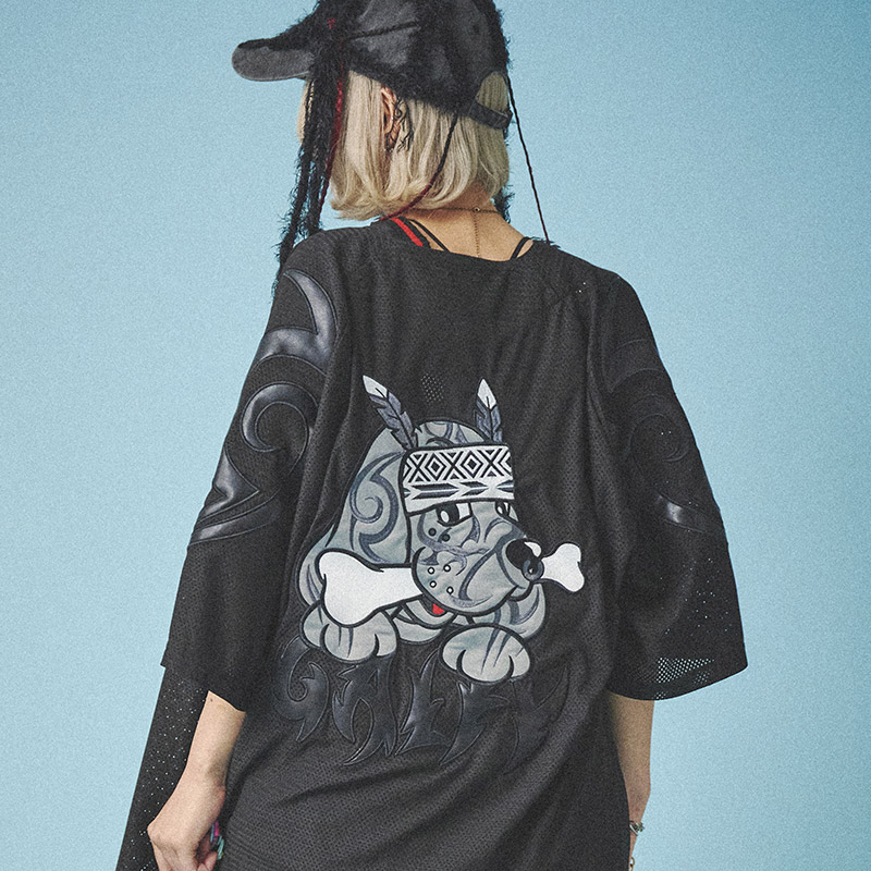 通気性の良いスポーティーなメッシュ素材を使用したベースボールシャツ。快適な着心地とトレンド感を兼ね備えた、オーバーサイズシルエットが魅力の一枚。バックに顔面トライバルなおなじみワンちゃんをアップリケ刺繍した、ストリート感満載の仕上がり。両袖部分のトライバル模様や、フロントロゴなど細部にまでこだわりの仕上がり。女性にもおすすめのユニセックスアイテムです。