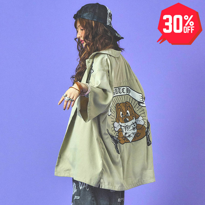 バックのウェッサイなギャングスタデザインのおなじみワンちゃんが存在感抜群のワークシャツ。ゆったりとしたオーバーサイズのアメリカンなボックス型シルエットでリラックスして着用できる一枚。フロントにはブランドロゴやメリケンサックデザインなど刺繍しました。サイドスリットの入ったゆったりとしたサイジングでストリートスタイルに大活躍間違いなし。女性にもおすすめのユニセックスアイテムになります。