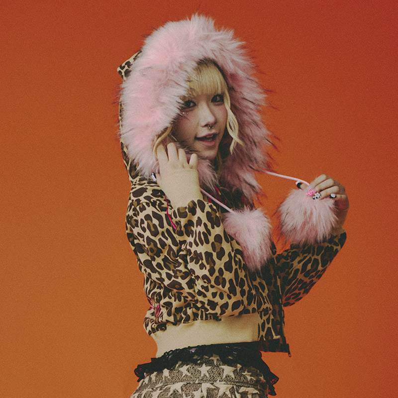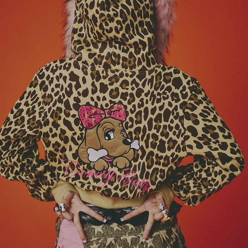 ヒョウ柄にショート丈が特徴的なジップフード。フード部分には耳とファーを配したポップでキュートな仕上がり。フードのドローコードの先にはファー素材のボンボンが!バックにはおなじみのキュートなワンちゃんをオン。リボン部分がレース風の刺繍になっているのが印象的。さらりとした風合いの裏パイル素材でリラックスして着用できるおすすめのアイテム。