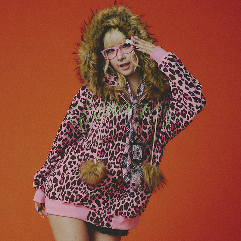 ヒョウ柄にショート丈が特徴的なジップフード。フード部分には耳とファーを配したポップでキュートな仕上がり。フードのドローコードの先にはファー素材のボンボンが!バックにはおなじみのキュートなワンちゃんをオン。リボン部分がレース風の刺繍になっているのが印象的。さらりとした風合いの裏パイル素材でリラックスして着用できるおすすめのアイテム。