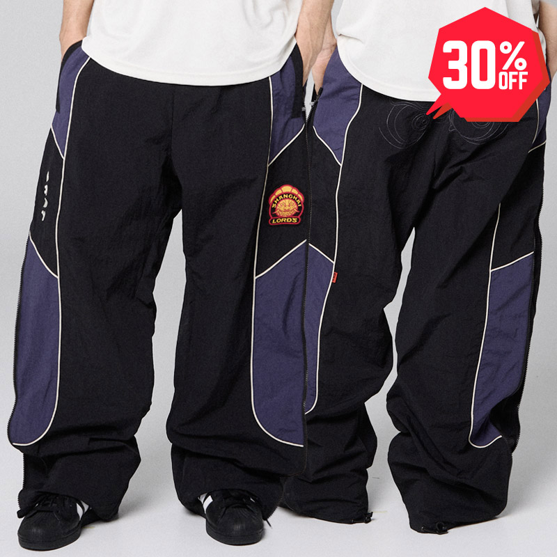 ブラックとパープルの切り返しが特徴的なナイロントラックパンツ♪