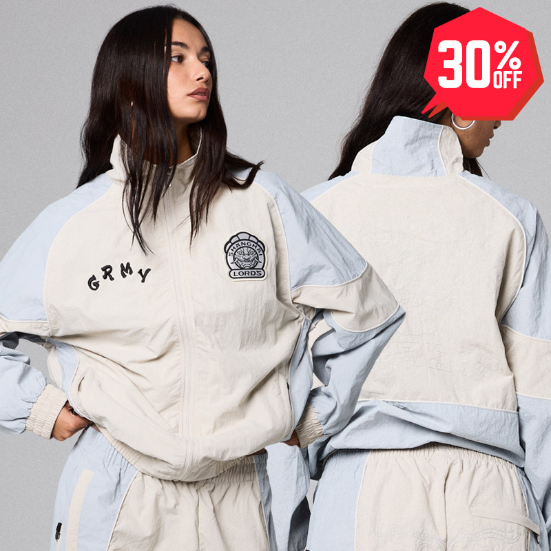オフホワイトとライトグレーの切り返しが特徴的なナイロントラックジャケット!!