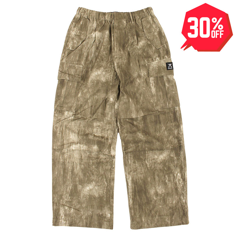 コットン生地に擦れたタイダイの様な総柄プリントを施したミリタリーカーゴパンツ。