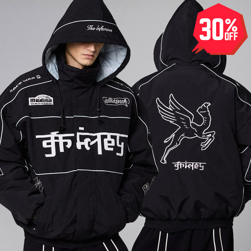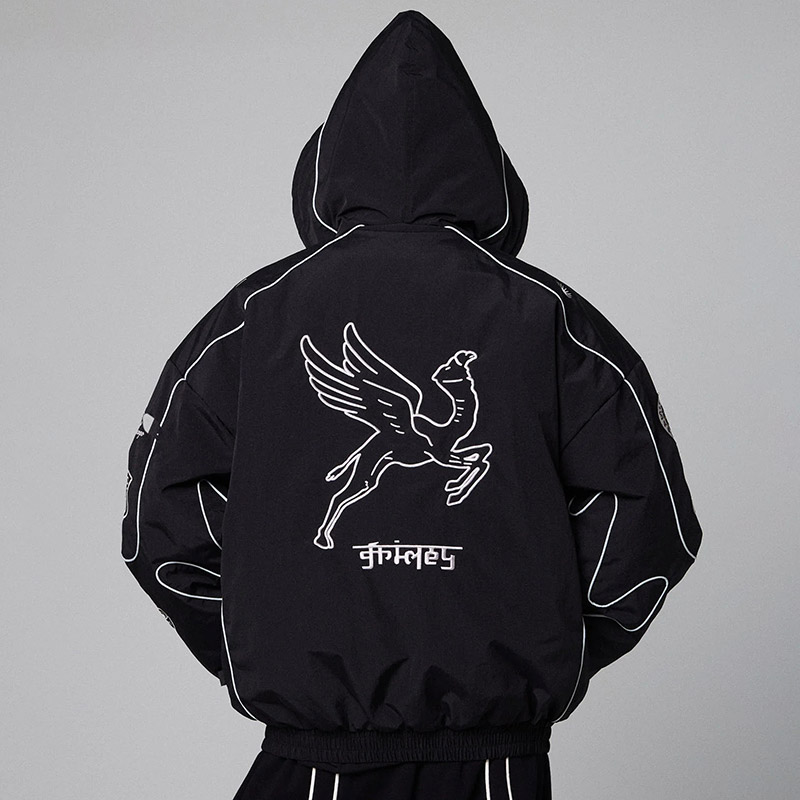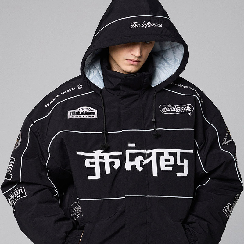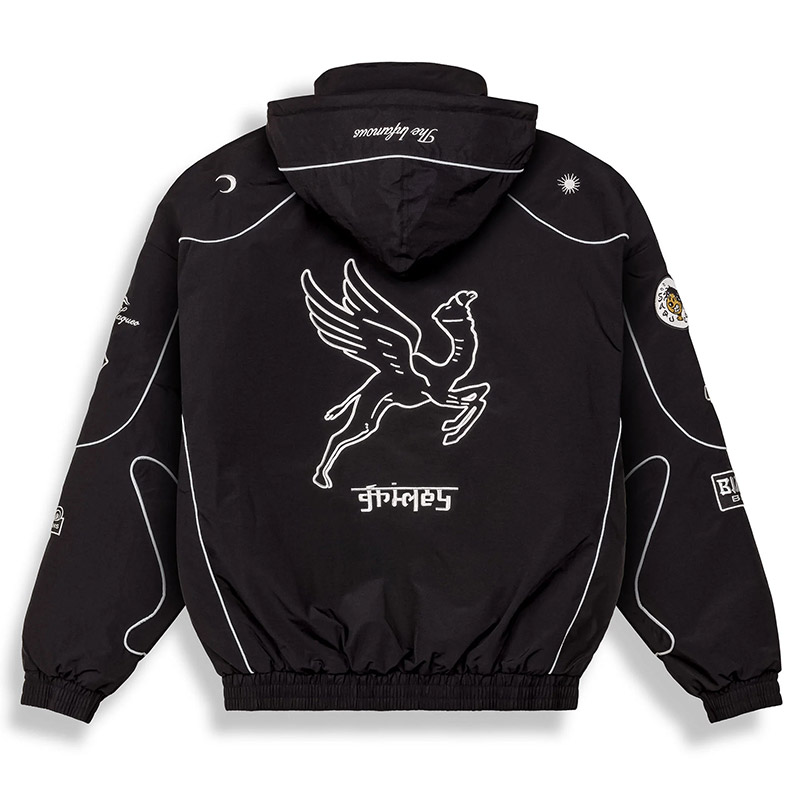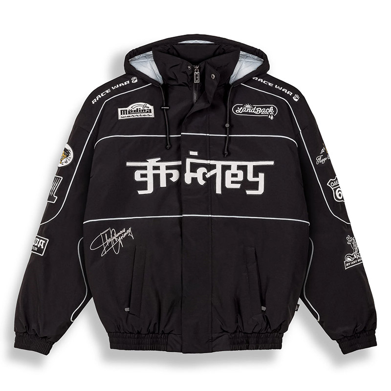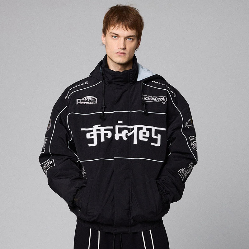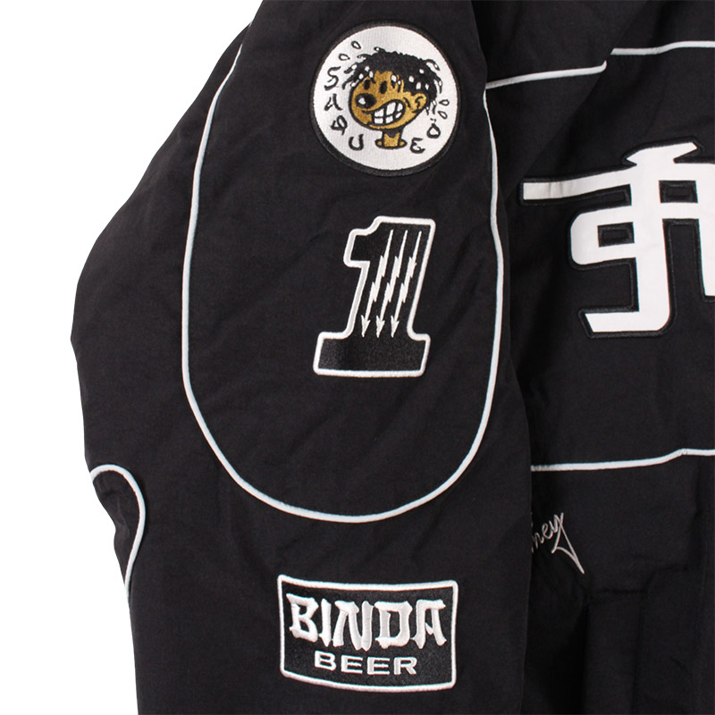 フロント、バック、両袖に様々なグラフィックスを刺繍やワッペンで落とし込んだレーシング仕様のフーデッドジャケット。ホワイトパイピングでの切り替えしが特徴的な一着。ゆったりとしたシルエットでリラックスして着用できるユニセックスでおすすめのアイテムです。