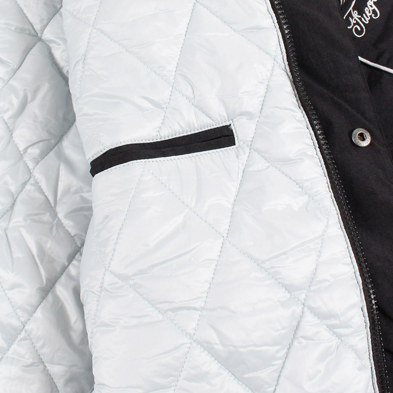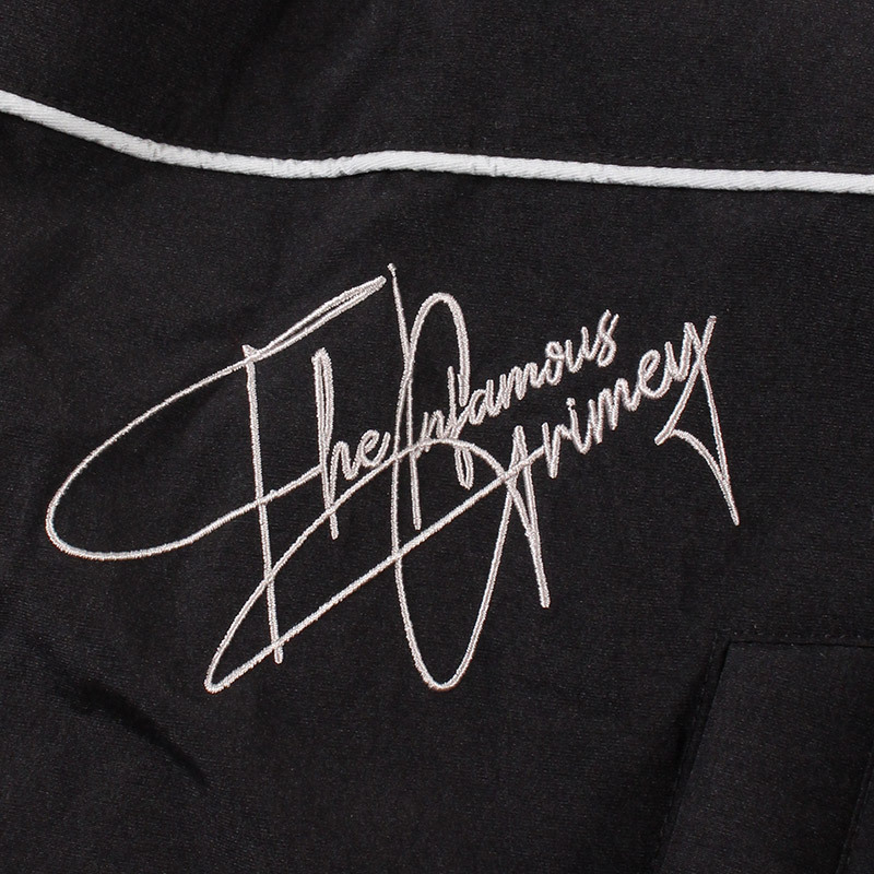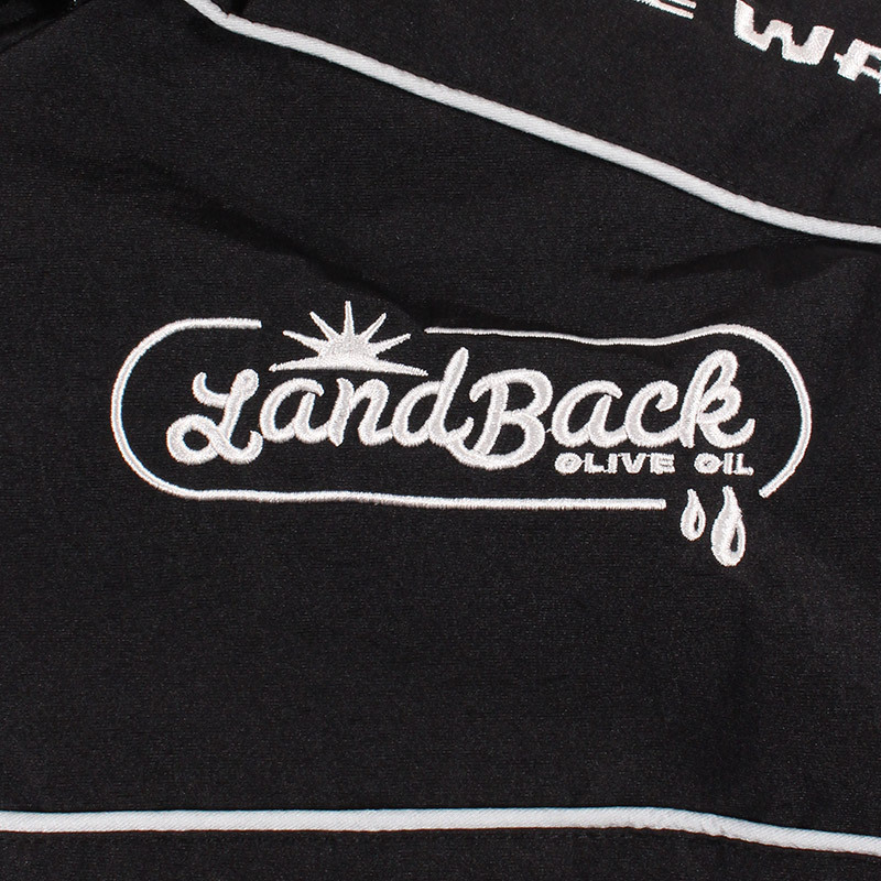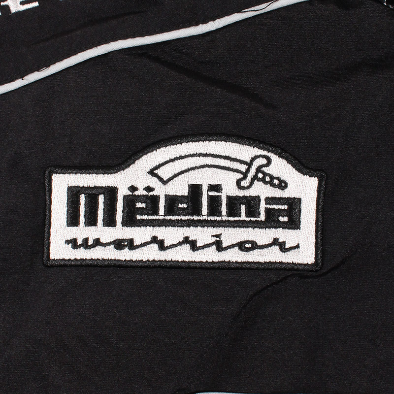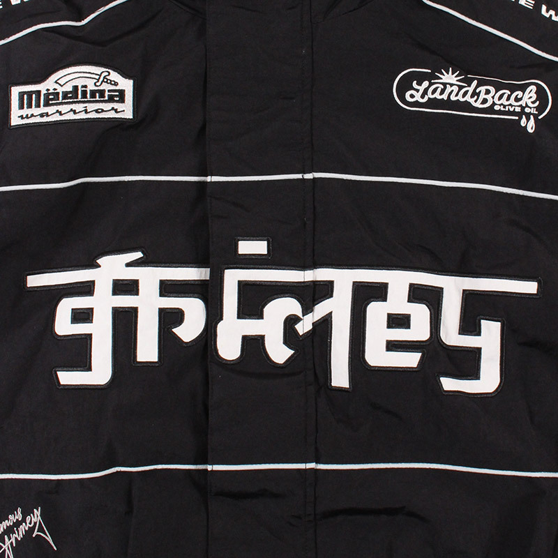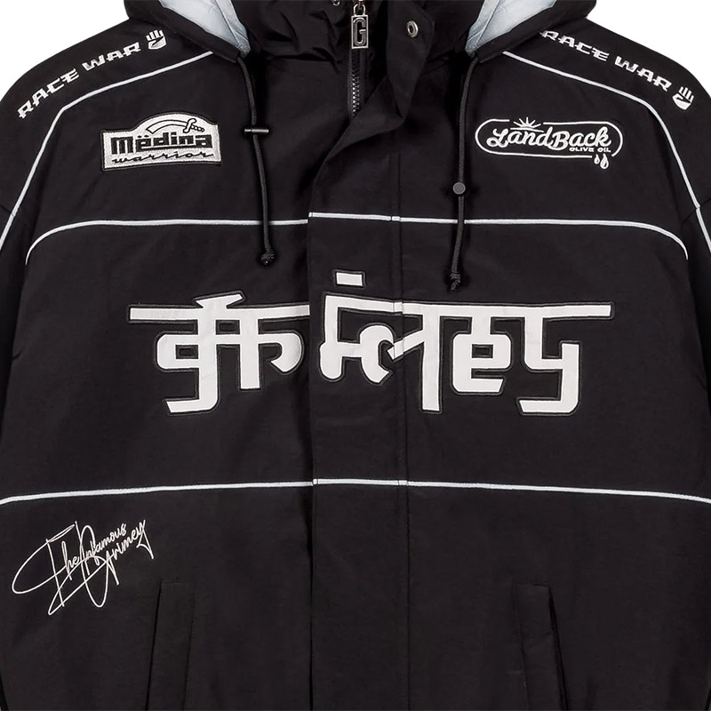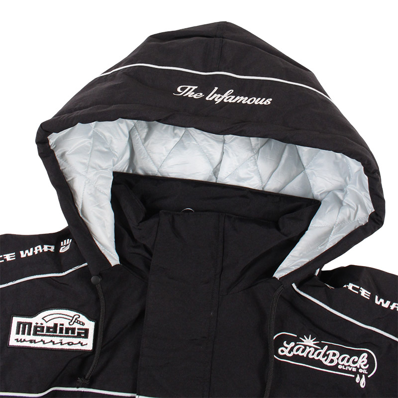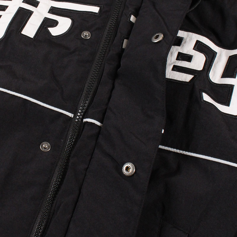 フロント、バック、両袖に様々なグラフィックスを刺繍やワッペンで落とし込んだレーシング仕様のフーデッドジャケット。ホワイトパイピングでの切り替えしが特徴的な一着。ゆったりとしたシルエットでリラックスして着用できるユニセックスでおすすめのアイテムです。