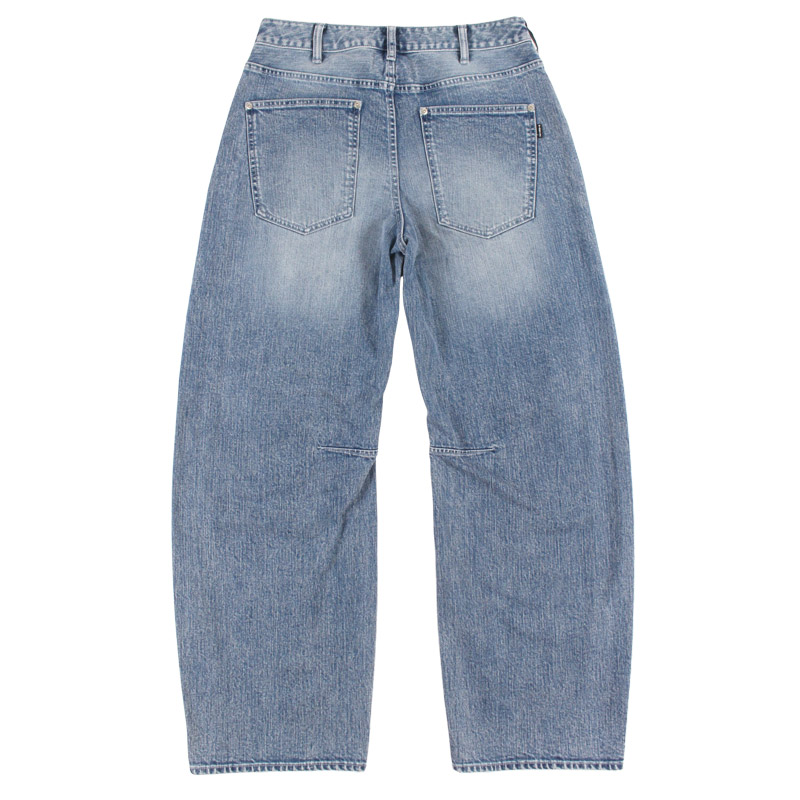 膝部分を二重にし補強をしたダブルニーデザインにリベットディティールを施したデニムパンツ。程よいハイウエストデザインで腰周りをすっきりと仕上げ、ワイドなシルエットながらもスタイルアップしてして見える一本。内側にダーツデザインを施し、立体感のあるトレンドのカーブラインが特徴的。ストーンウォッシュやサンドブラスト加工を施したヴィンテージな雰囲気の一本。ややストレッチの効いた素材でリラックスして着用できる仕上がり。シルエットや雰囲気が抜群のユニセックスでオススメのデニム。