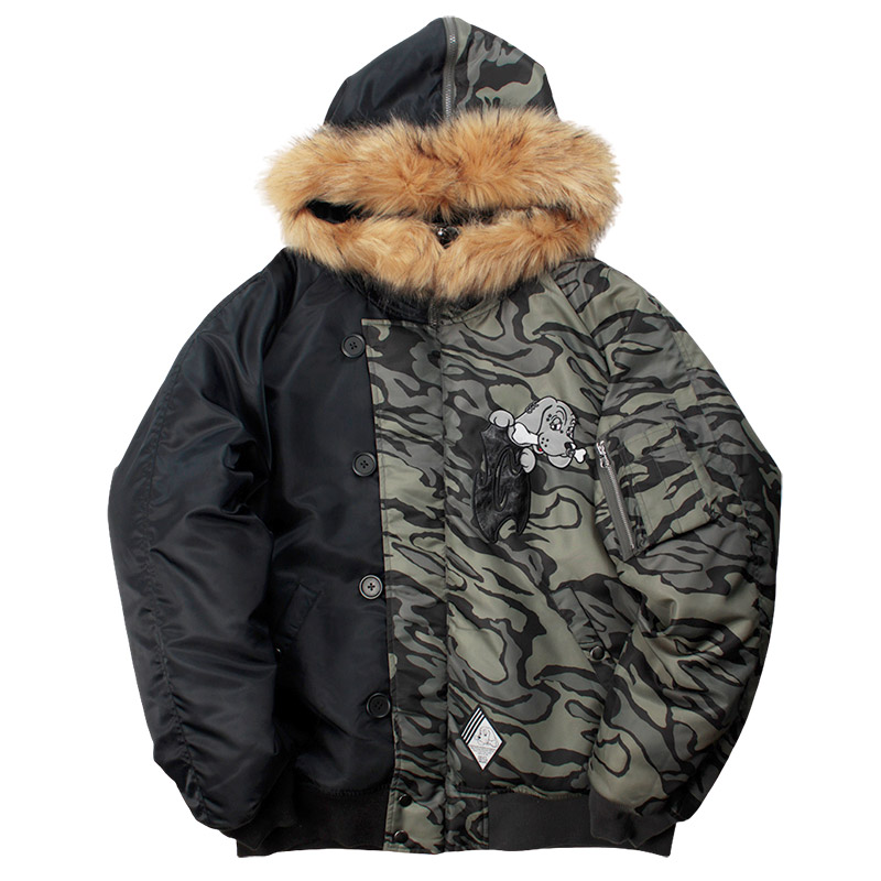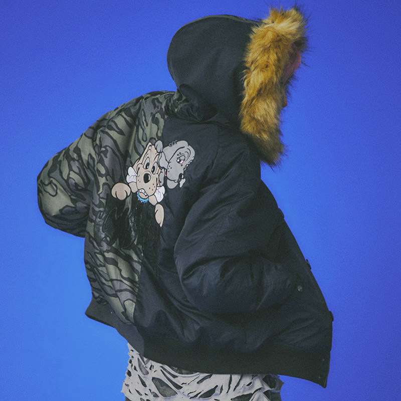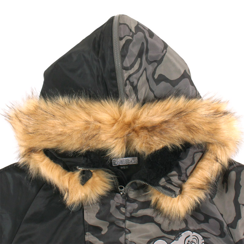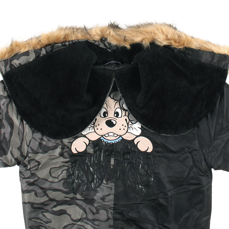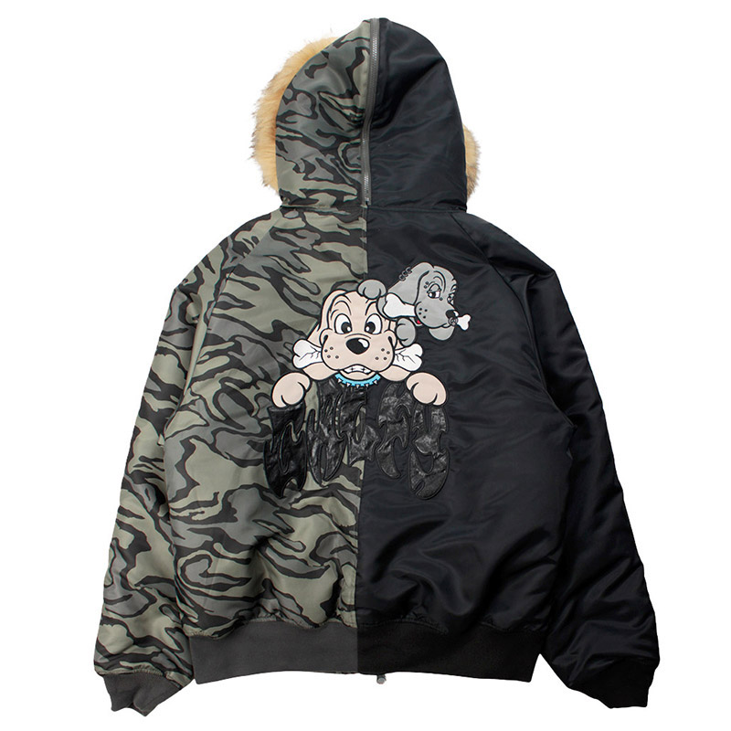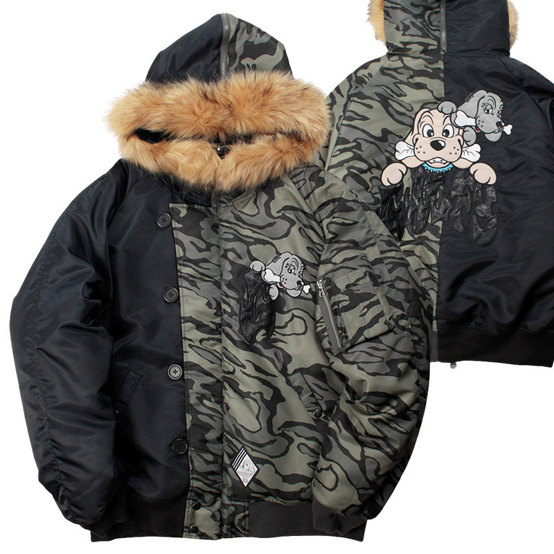 ミリタリーなフライトジャケット【N-2B】をGALFYのフィルターを通して落とし込んだ存在感抜群の一着。フロント、バックにおなじみのワンちゃんデザインをオン。大きめのフードは裏地部分はボア仕様で2分割式。着脱可能なフード部分のファーや左袖のユーティリティーポケットなど、細部にまでこだわったミリタリーな仕上がりが特徴です。ウィンターシーズンに大活躍するユニセックスでオススメのアイテムです。