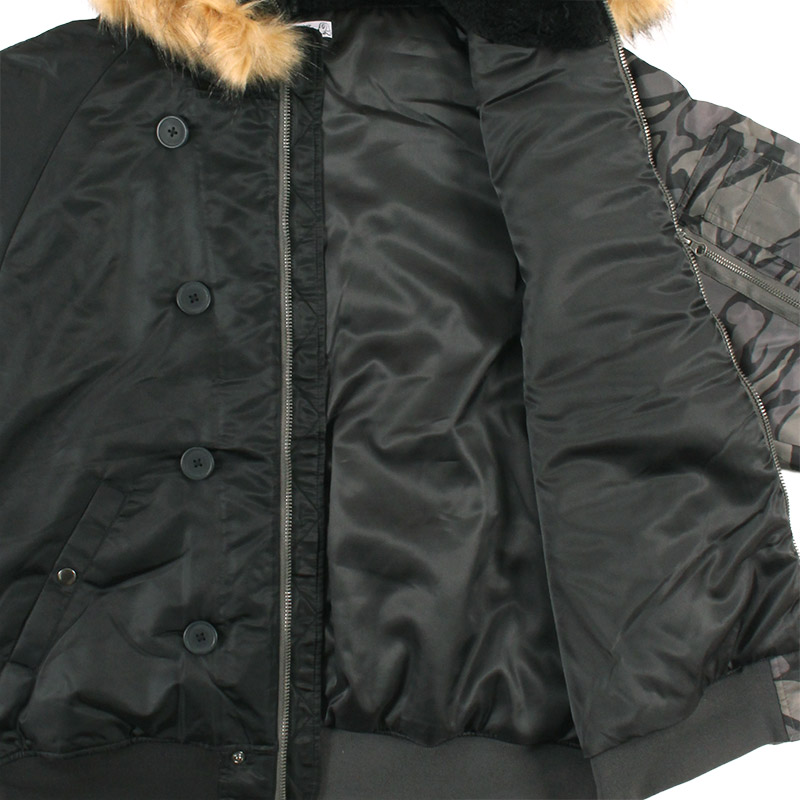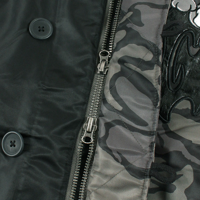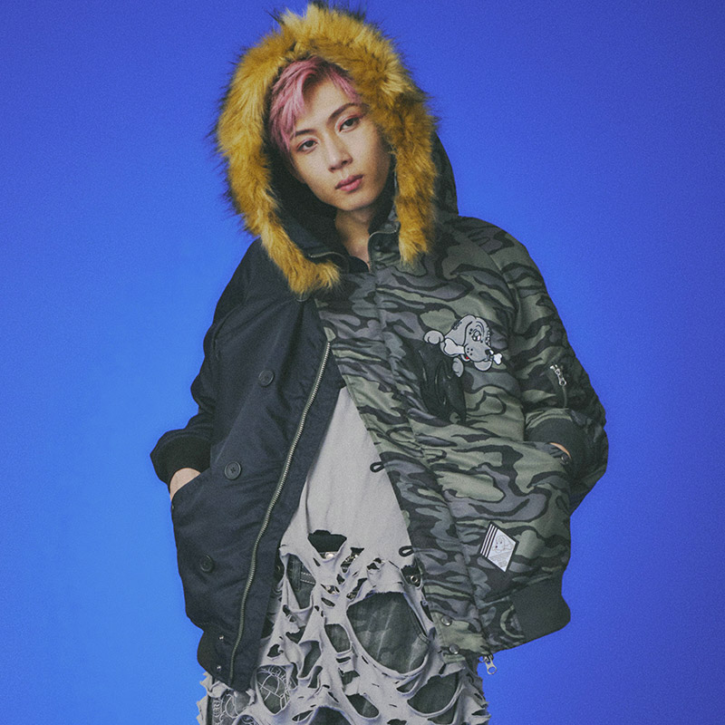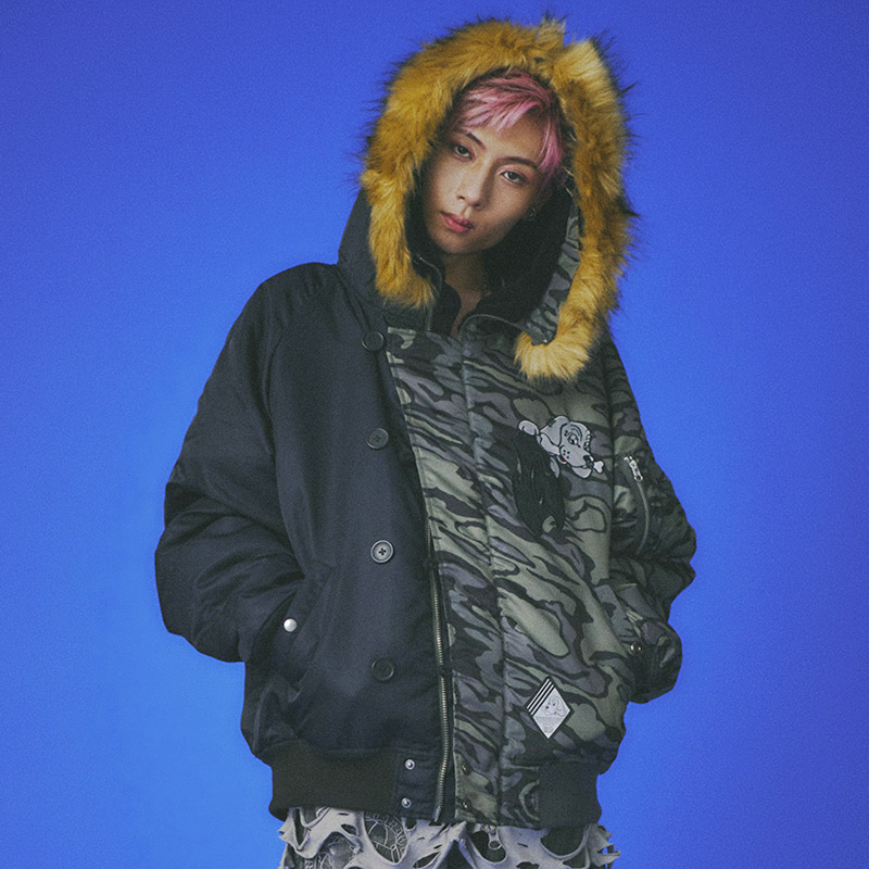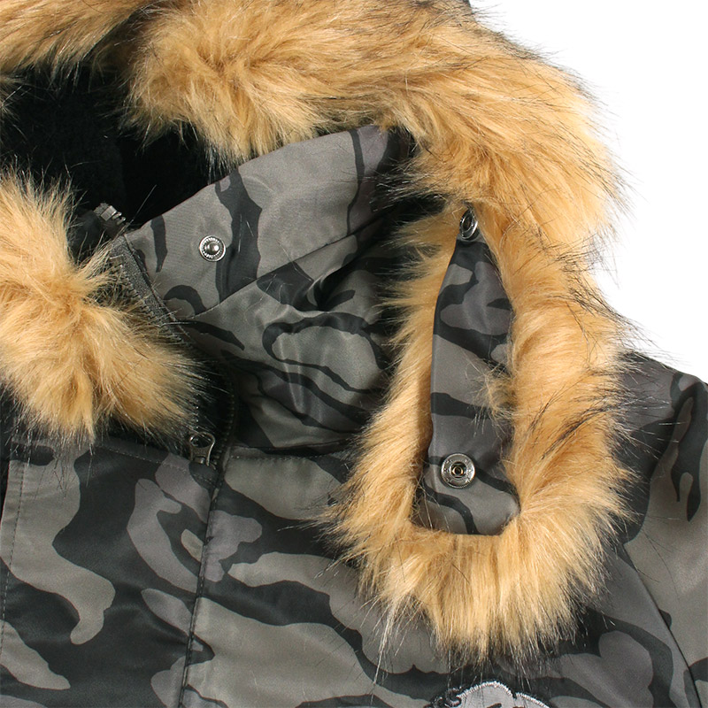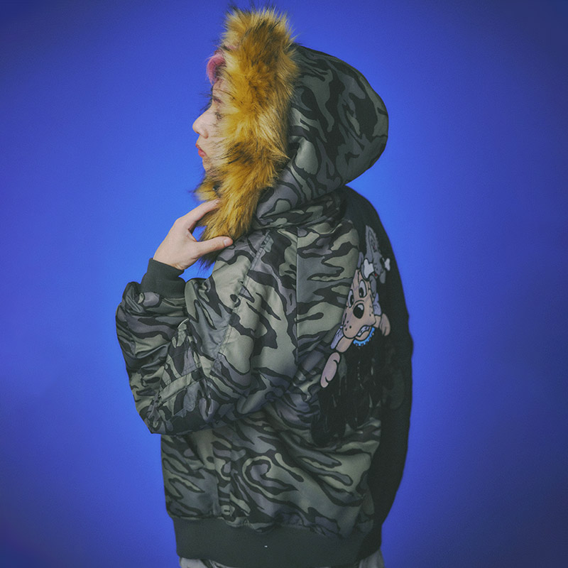 ミリタリーなフライトジャケット【N-2B】をGALFYのフィルターを通して落とし込んだ存在感抜群の一着。フロント、バックにおなじみのワンちゃんデザインをオン。大きめのフードは裏地部分はボア仕様で2分割式。着脱可能なフード部分のファーや左袖のユーティリティーポケットなど、細部にまでこだわったミリタリーな仕上がりが特徴です。ウィンターシーズンに大活躍するユニセックスでオススメのアイテムです。