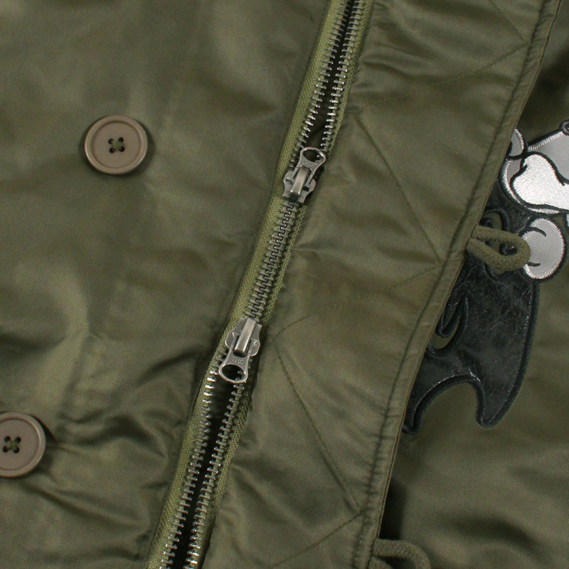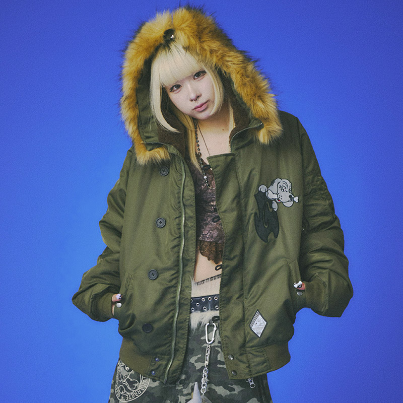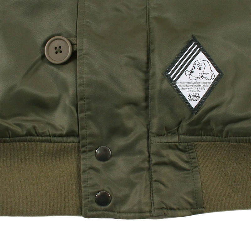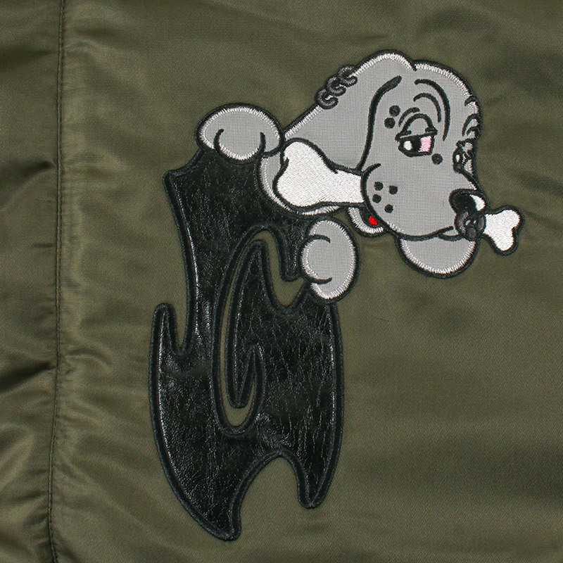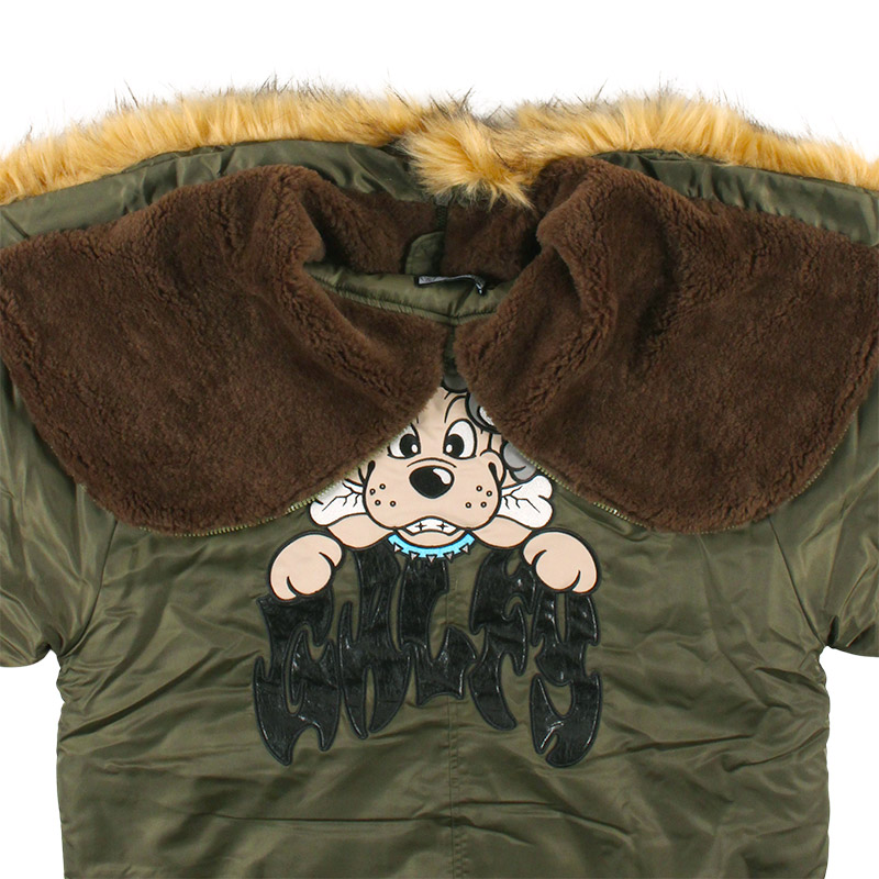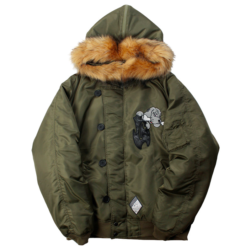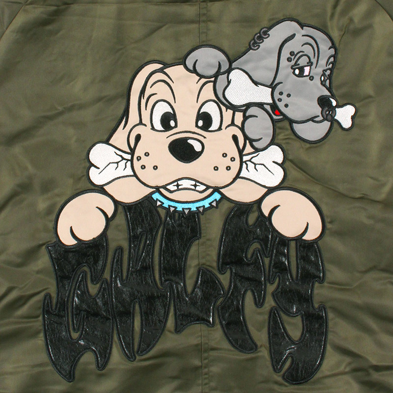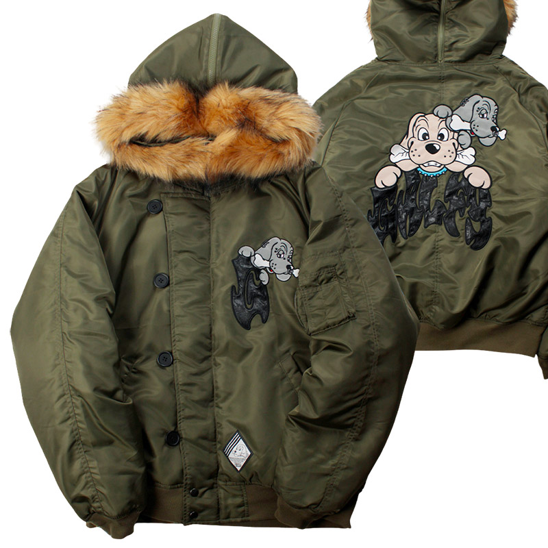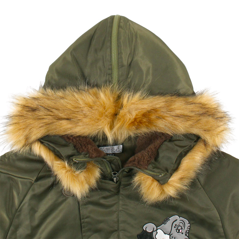 ミリタリーなフライトジャケット【N-2B】をGALFYのフィルターを通して落とし込んだ存在感抜群の一着。フロント、バックにおなじみのワンちゃんデザインをオン。大きめのフードは裏地部分はボア仕様で2分割式。着脱可能なフード部分のファーや左袖のユーティリティーポケットなど、細部にまでこだわったミリタリーな仕上がりが特徴です。ウィンターシーズンに大活躍するユニセックスでオススメのアイテムです。