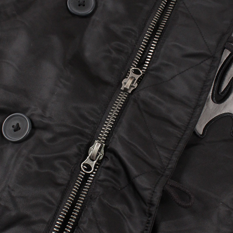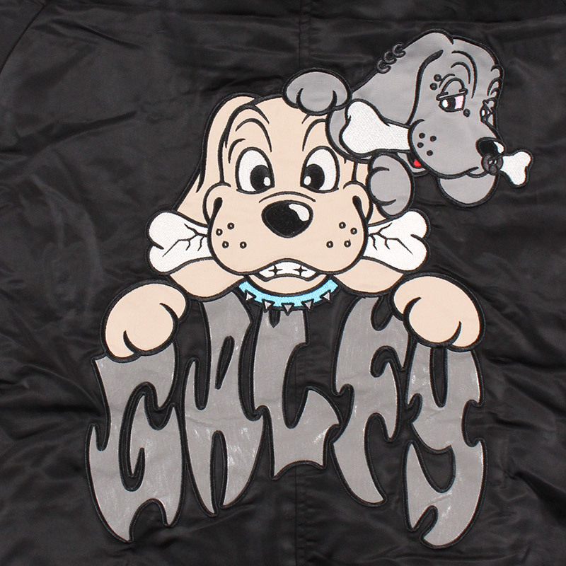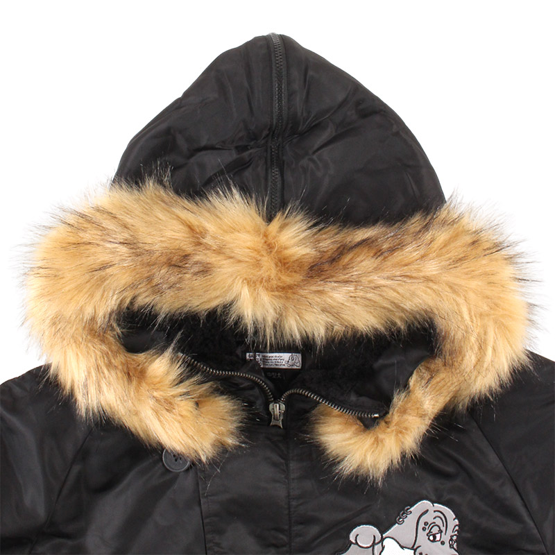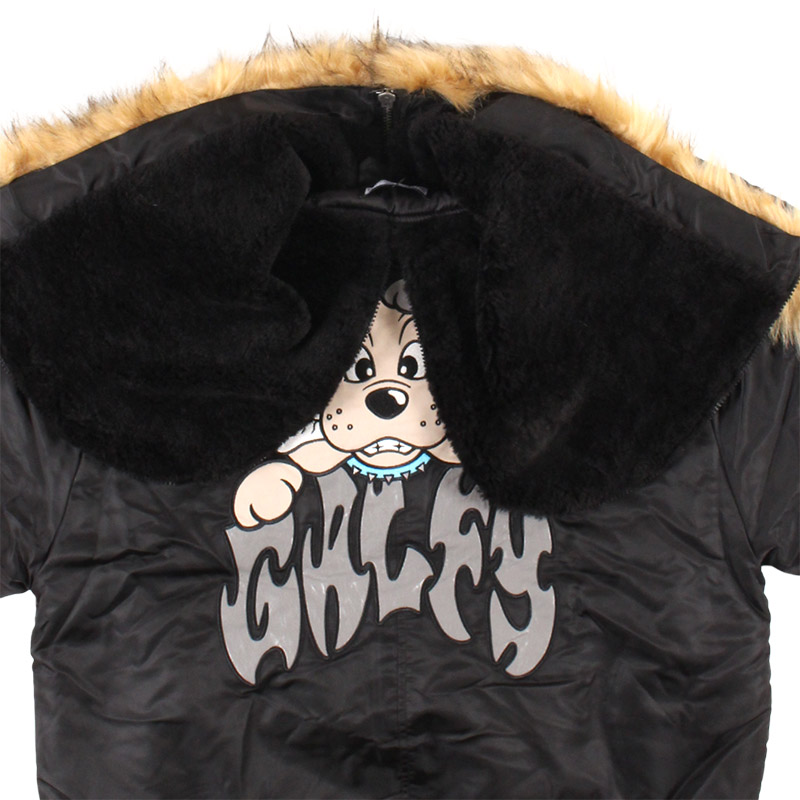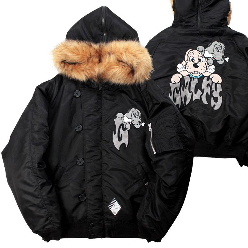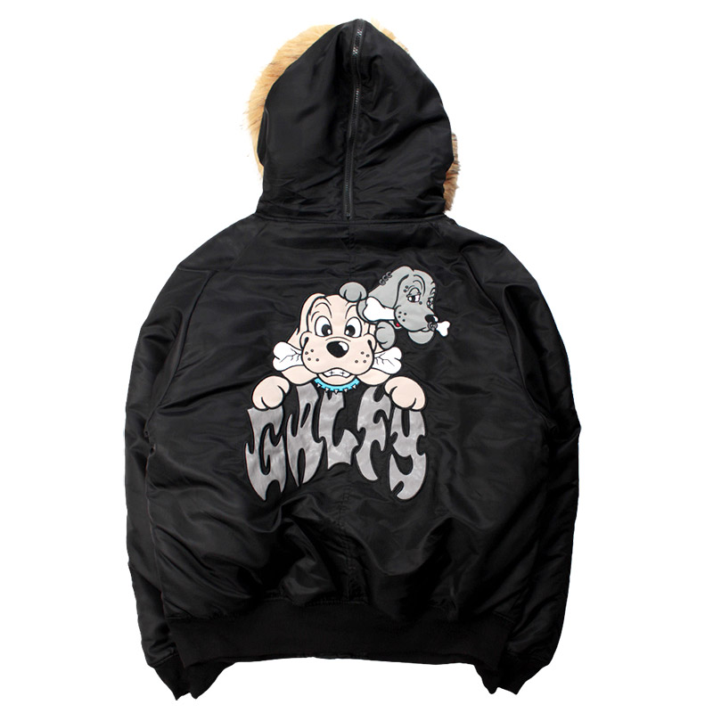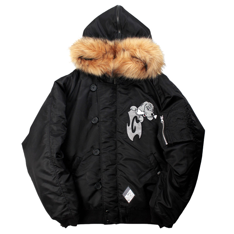 ミリタリーなフライトジャケット【N-2B】をGALFYのフィルターを通して落とし込んだ存在感抜群の一着。フロント、バックにおなじみのワンちゃんデザインをオン。大きめのフードは裏地部分はボア仕様で2分割式。着脱可能なフード部分のファーや左袖のユーティリティーポケットなど、細部にまでこだわったミリタリーな仕上がりが特徴です。ウィンターシーズンに大活躍するユニセックスでオススメのアイテムです。