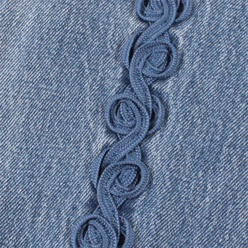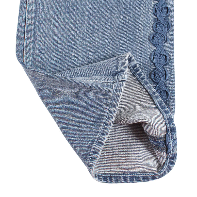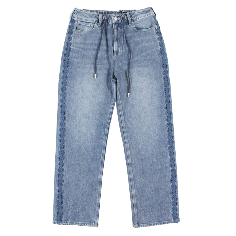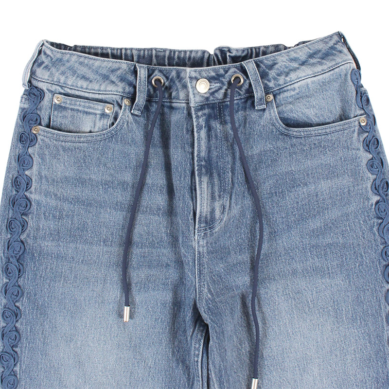 アウトシームのレースの装飾が特徴的なデニムパンツ。