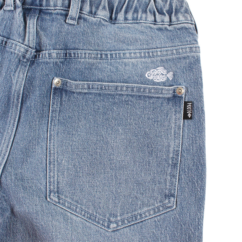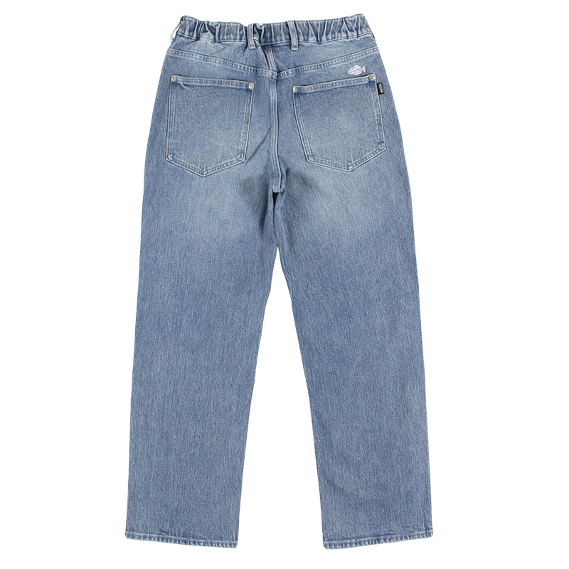 ストレッチの効いたデニム素材に、ウェストゴム&紐のイージーパンツ仕様でリラックスして着用できるデニムパンツ。程よくヴィンテージ加工を施した絶妙な色合いが魅力。バックポケット上にさり気なくフィッシュロゴを刺繍しました。ストリートスタイルにマストなユニセックスでおすすめのアイテムです。