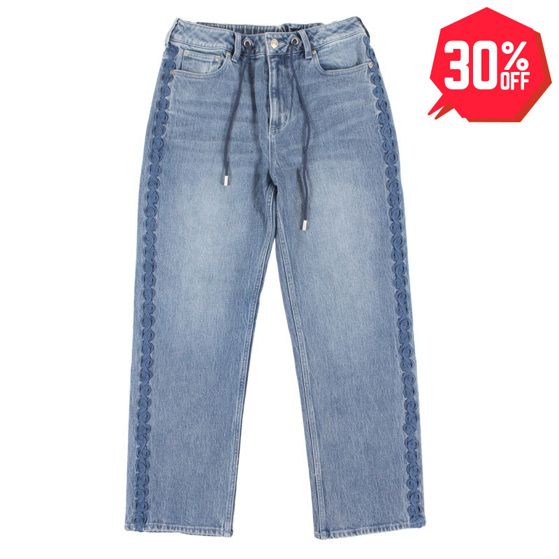 アウトシームに配置したレースの装飾が特徴的なデニムパンツ。