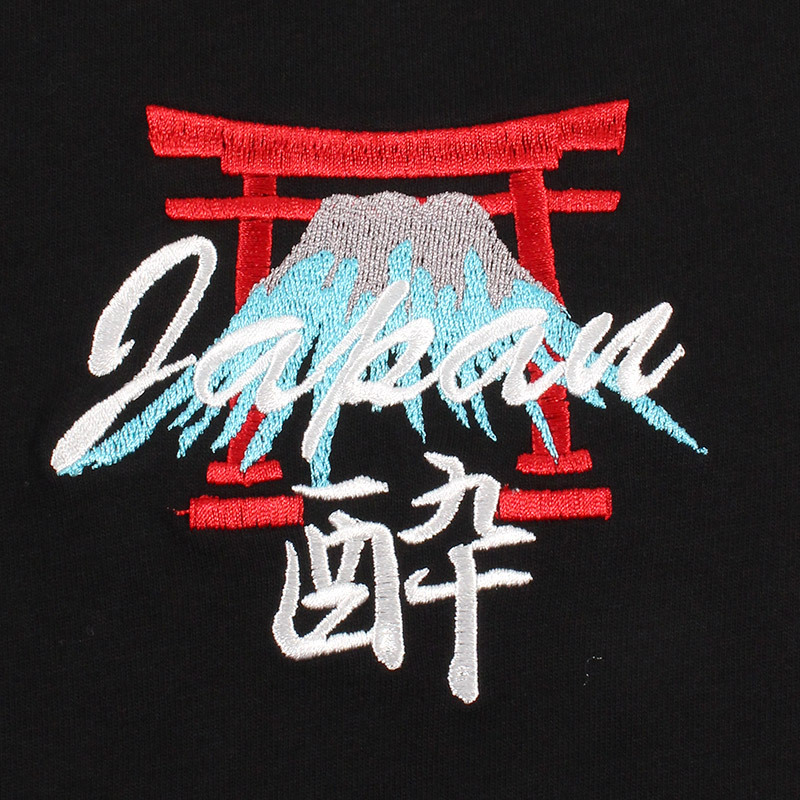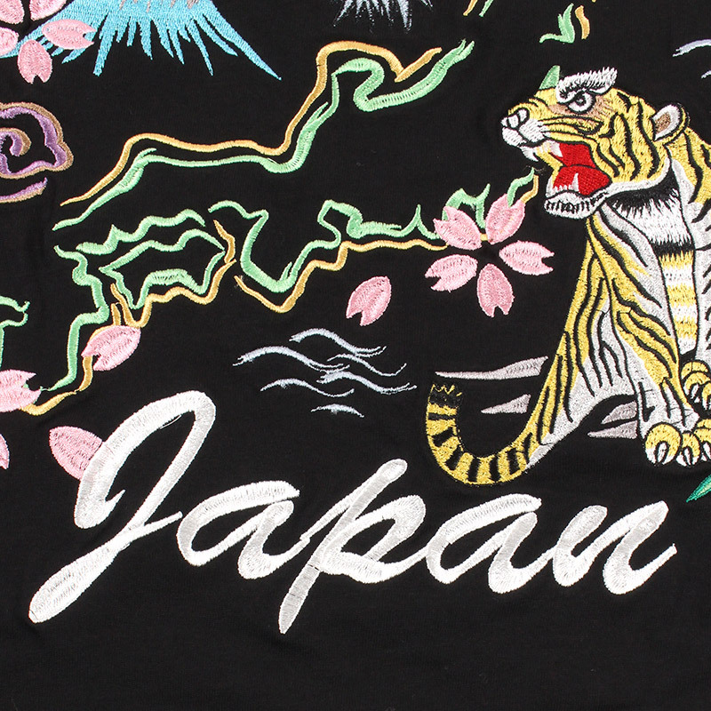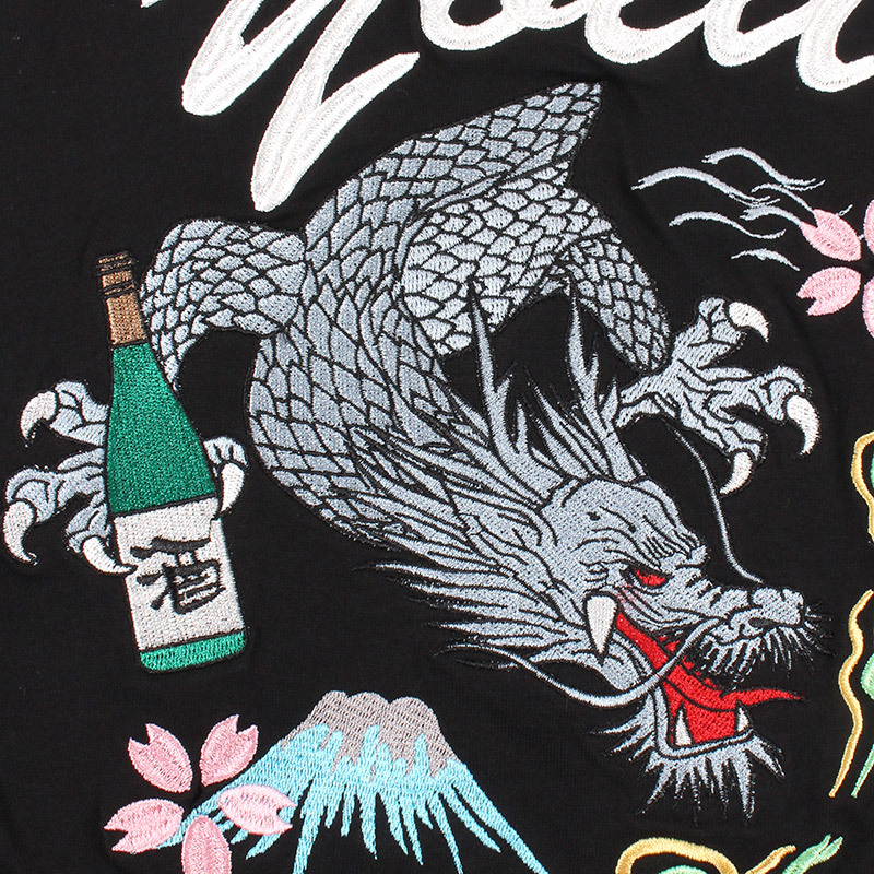 バックに、龍・虎・日本地図・桜・富士などのスカジャン風グラフィックスをオール刺繍で表現した存在感バグツンの一枚。フロントには鳥居と富士デザインを刺繍しました。ややゆったりめのルーズなシルエットは適度なリラックス感があり、ラフな呑みシーンでのコーディネートに取り入れたいマストなアイテムです。