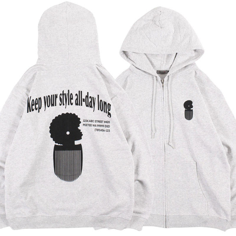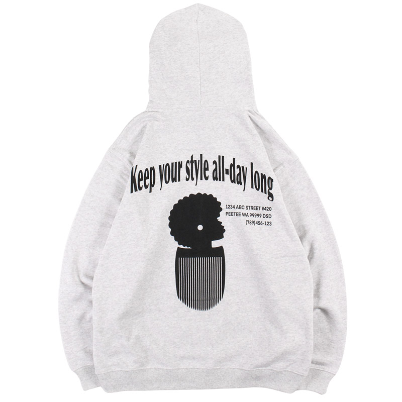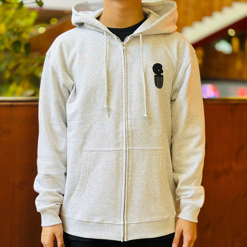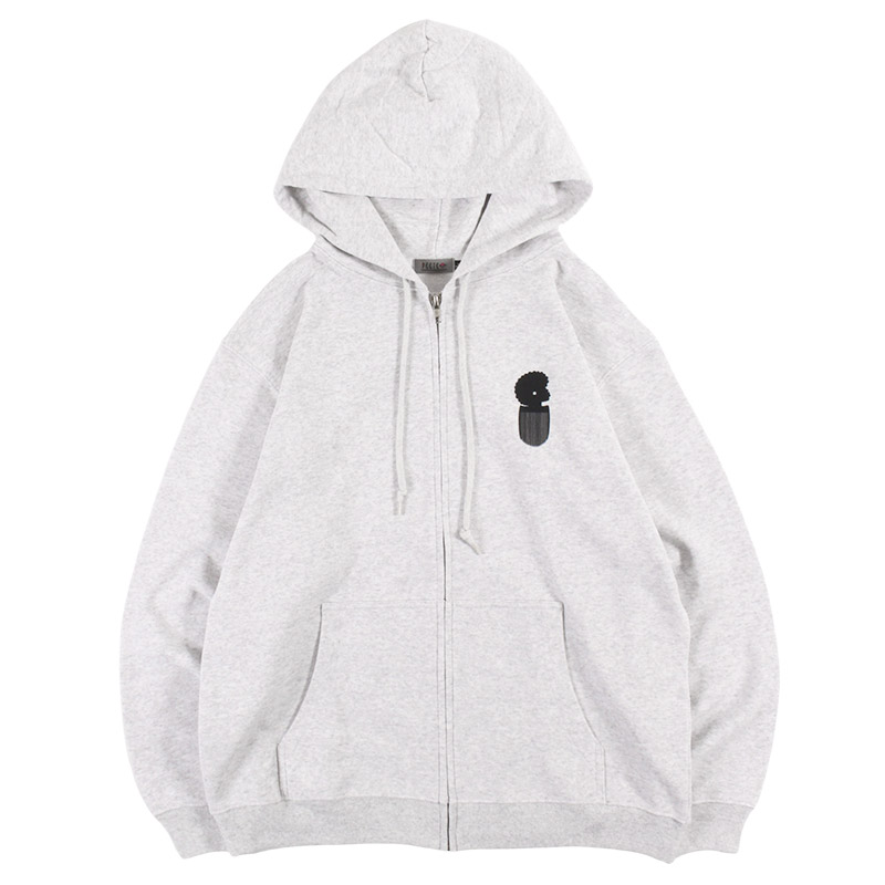 PUSHIMデザインのアフロガールのコームデザインをオンした一枚。薄すぎない絶妙な厚みの8.8オンスの裏パイル地でロングシーズン使える仕上がり。薄くペラペラな印象にならないよう、生地のかたさや伸縮性、フードの立体感を演出する厚みにこだわり、理想的な生地に仕上げられています。フルジップ仕様で脱ぎ着しやすくアウターとしても、インナーとしても使える優秀アイテム。ざっくりとしたトレンド感あるシルエットが魅力のユニセックスアイテムです。