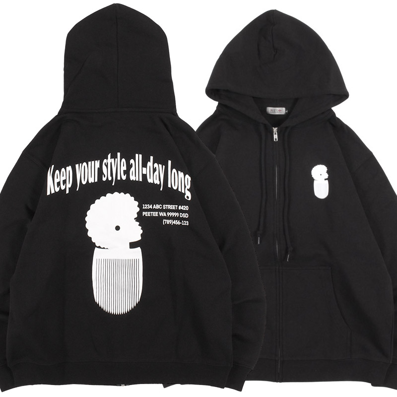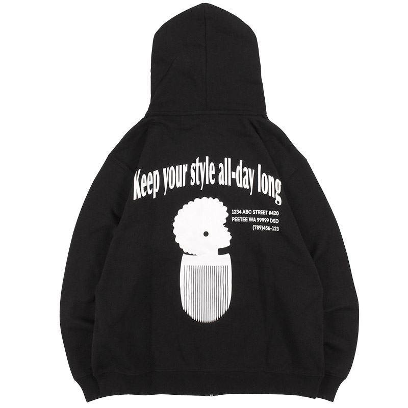 PUSHIMデザインのアフロガールのコームデザインをオンした一枚。薄すぎない絶妙な厚みの8.8オンスの裏パイル地でロングシーズン使える仕上がり。薄くペラペラな印象にならないよう、生地のかたさや伸縮性、フードの立体感を演出する厚みにこだわり、理想的な生地に仕上げられています。フルジップ仕様で脱ぎ着しやすくアウターとしても、インナーとしても使える優秀アイテム。ざっくりとしたトレンド感あるシルエットが魅力のユニセックスアイテムです。