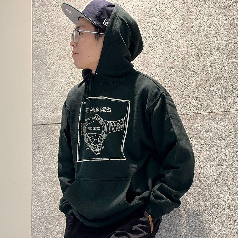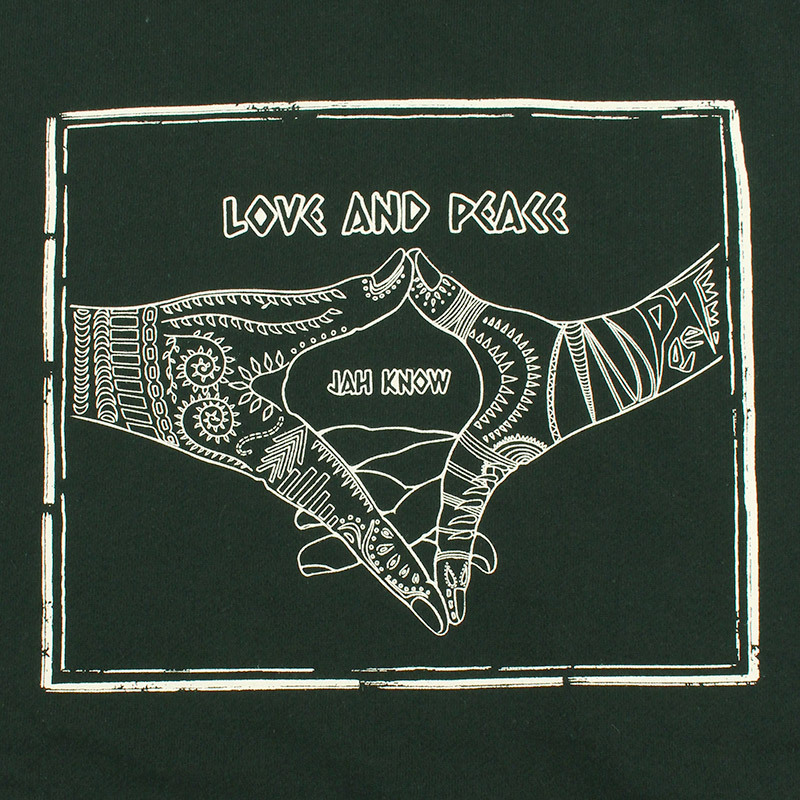 JAHを讃えるラブアンドピースでラスタなハンドサインをデザインしたプルオーバーパーカー。薄すぎない絶妙な厚みの8.8オンスの裏パイル地でロングシーズン使える仕上がり。薄くペラペラな印象にならないよう、生地のかたさや伸縮性、フードの立体感を演出する厚みにこだわり、理想的な生地に仕上げられています。カジュアルな装いの中に、抜け感を手軽に演出することができ、デイリーで活躍できる一枚。ざっくりとしたトレンド感あるシルエットが魅力のユニセックスアイテムです。