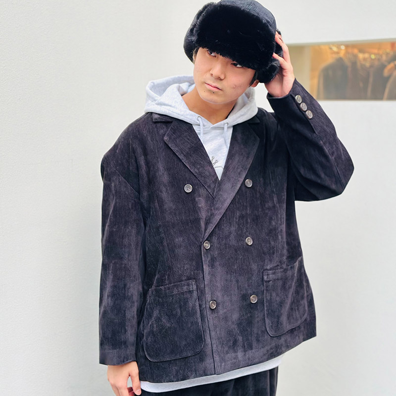 首元がすっきりとしたダブルブレストデザインで、フーディーやハイネック等のインナーやボリューム感のあるマフラーなどとも好相性。肩幅と身幅にゆとりを持たせたトレンドライクなルーズシルエットで、ダメージデニムパンツやカーゴパンツなどとのコーデでストリートスタイルにもマストなユニセックスアイテムです。同素材のスラックスとのセットアップスタイルもお楽しみ頂けます。