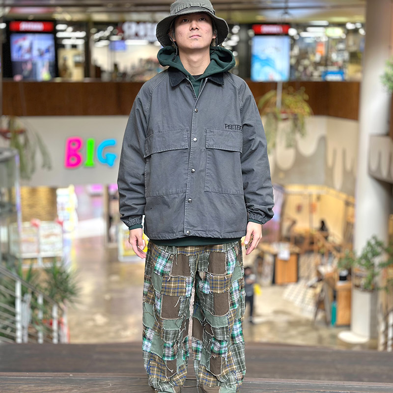 🍀無骨なジャケットに深緑のパーカーをレイヤードし、存在感のあるパッチワークパンツでストリートを表現💥