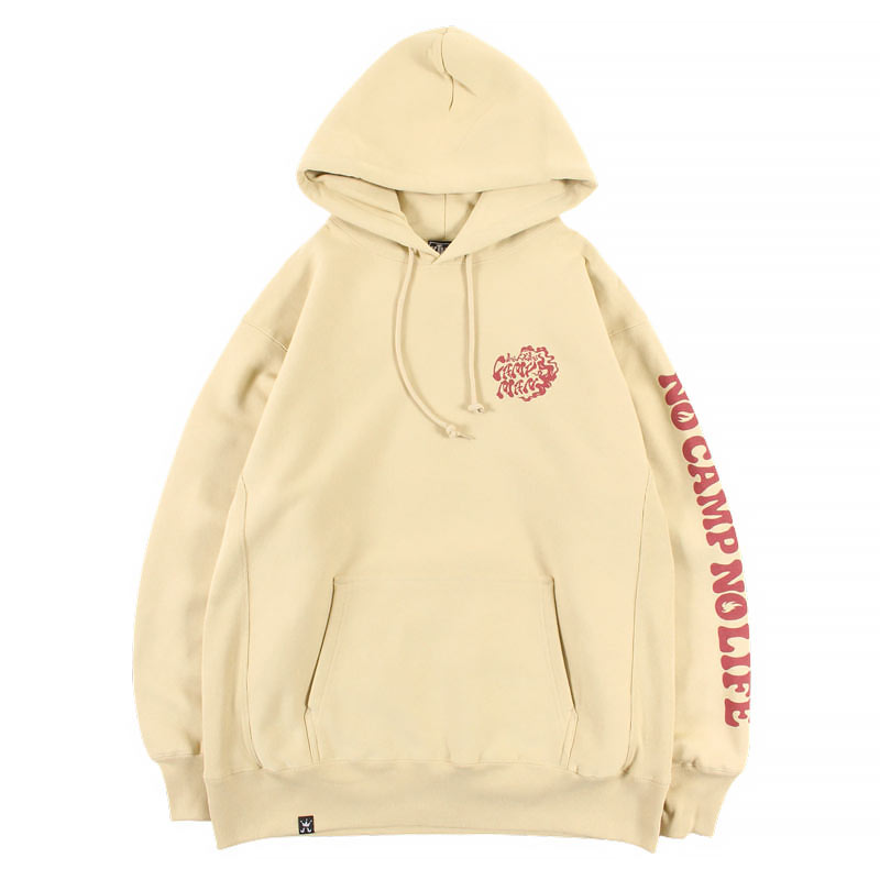 知る人ぞ知るCAMPMANである団長NG HEADがデザインしたグラフィックスをバックにオンしたプルオーバーパーカ。フロントにはスモーキーなロゴ、左袖には『NO CAMP NO LIFE』のメッセージが!