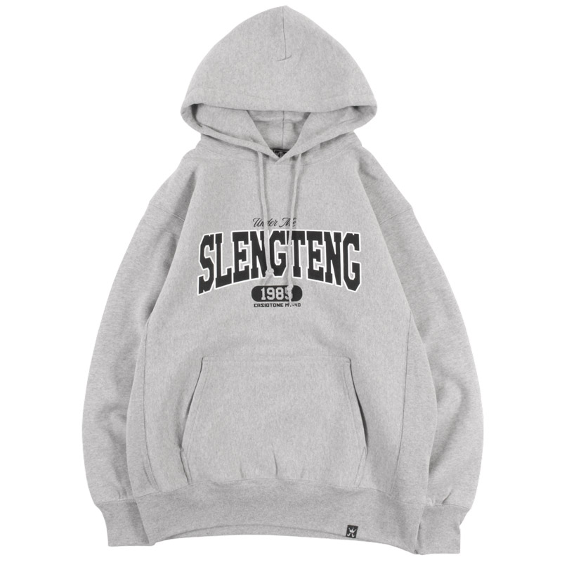 世界のダンスホールシーンを変えた革命的なRIDDIM【SLENG TENG】。デジタルレゲエの時代を切り開いた伝説のRIDDIMをクラシックなカレッジロゴでフロントにオンしたプルオーバーパーカー。レゲエ好きはもちろん、ミュージックカルチャーをファッションに落とし込みたい方にもオススメのアイテム。ウォーム感のある12オンスのヘビーウェイトの裏起毛素材を使用。しっかりした強度のあるリブとトレンド感のあるざっくりシルエットが特長。オープンエンド糸の持つ独特の風合いにより、味のある「ムラ感」と「ザラ感」を楽しむことができる仕上がりで着込むほどにエイジングを楽しめます。身頃の生地目は横取り、脇下はリブ生地のサイドパネルのリバースウィーブ仕様。アメリカンクラシックな装いのストリートスタイルにマストなユニセックスでおすすめのアイテム。