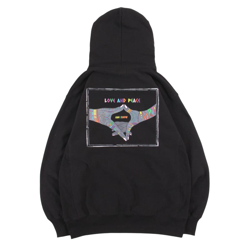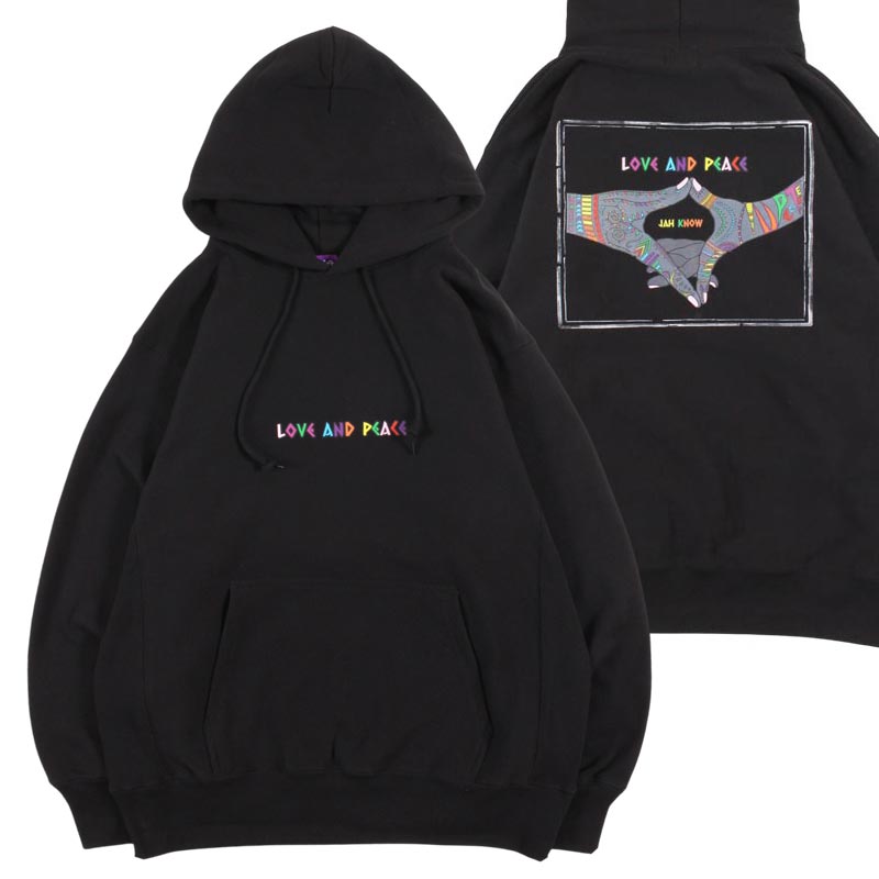 JAHを讃えるラブアンドピースでラスタなハンドサインをバックにデザインしたフーディー。ウォーム感のある12オンスのヘビーウェイトの裏起毛素材を使用した一着。しっかりした強度のあるリブとトレンド感のあるざっくりシルエットが特長。オープンエンド糸の持つ独特の風合いにより、味のある「ムラ感」と「ザラ感」を楽しむことができる仕上がりで着込むほどにエイジングを楽しめます。身頃の生地目は横取り、脇下はリブ生地のサイドパネルのリバースウィーブ仕様。アメリカンクラシックな装いのストリートスタイルにマストなユニセックスでおすすめのアイテム。
