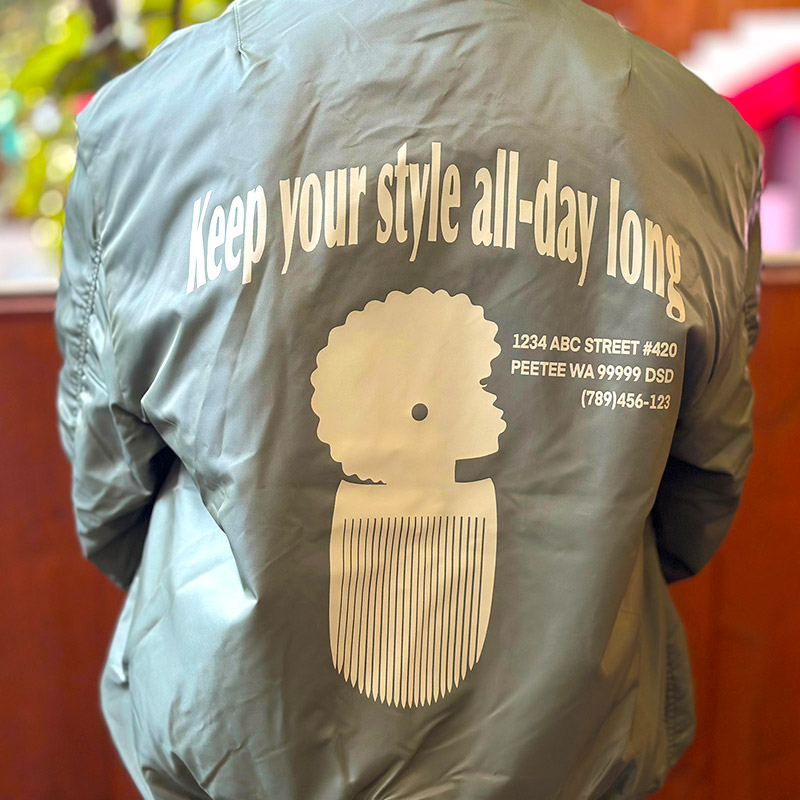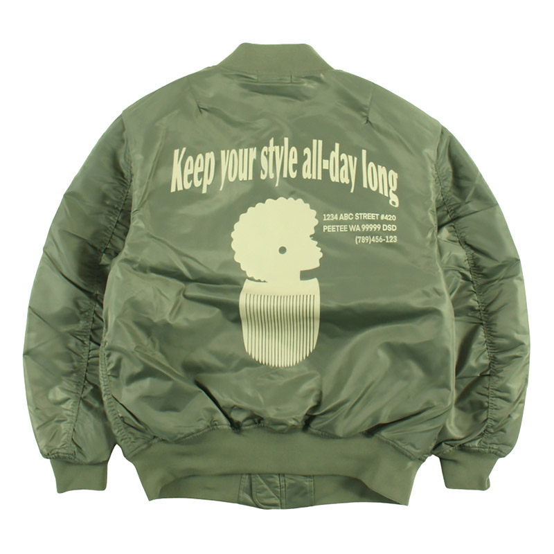 PUSHIMデザインのアフロガールのコームデザインをバックにオンフライトジャケットのマスターピース『MA-1』