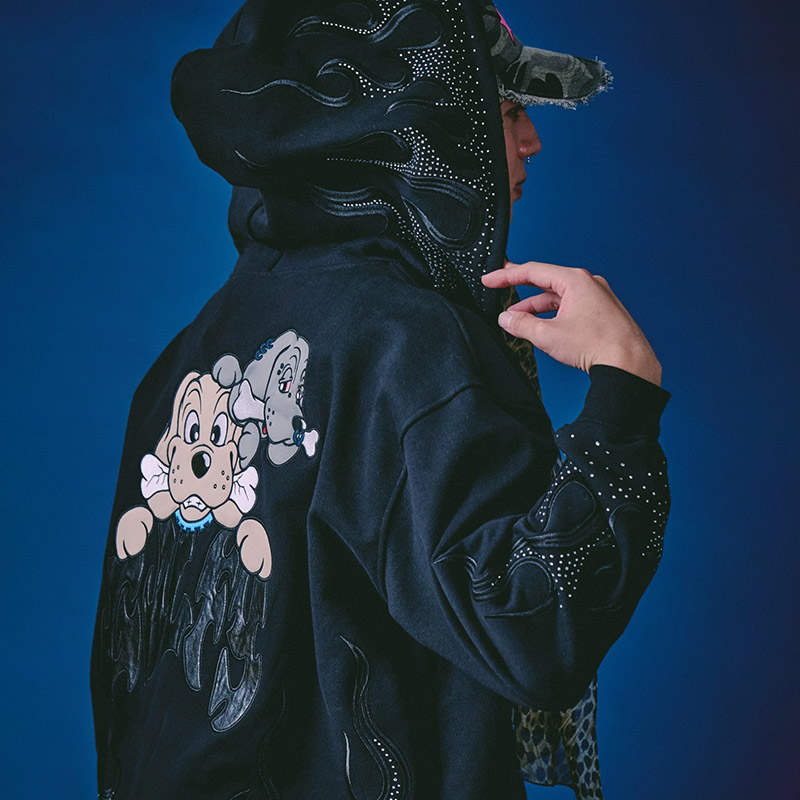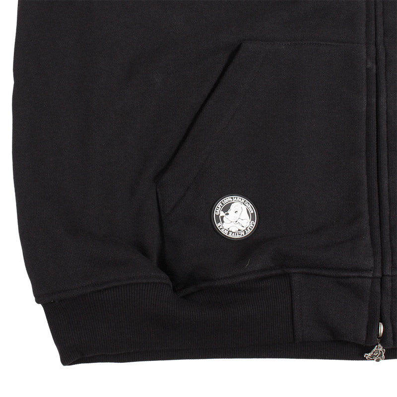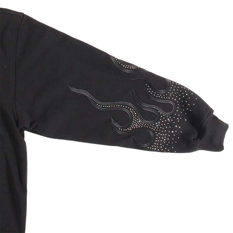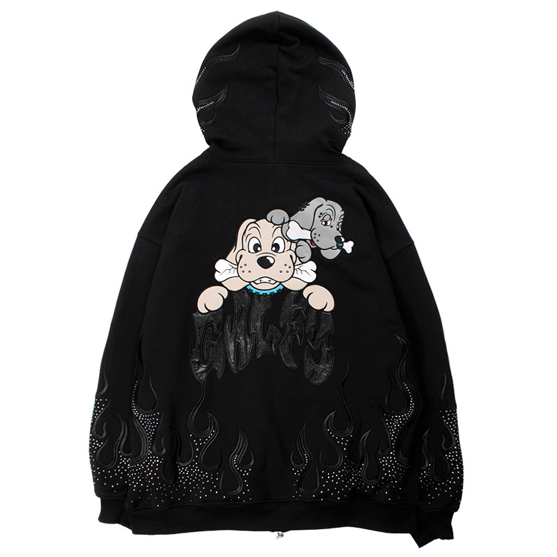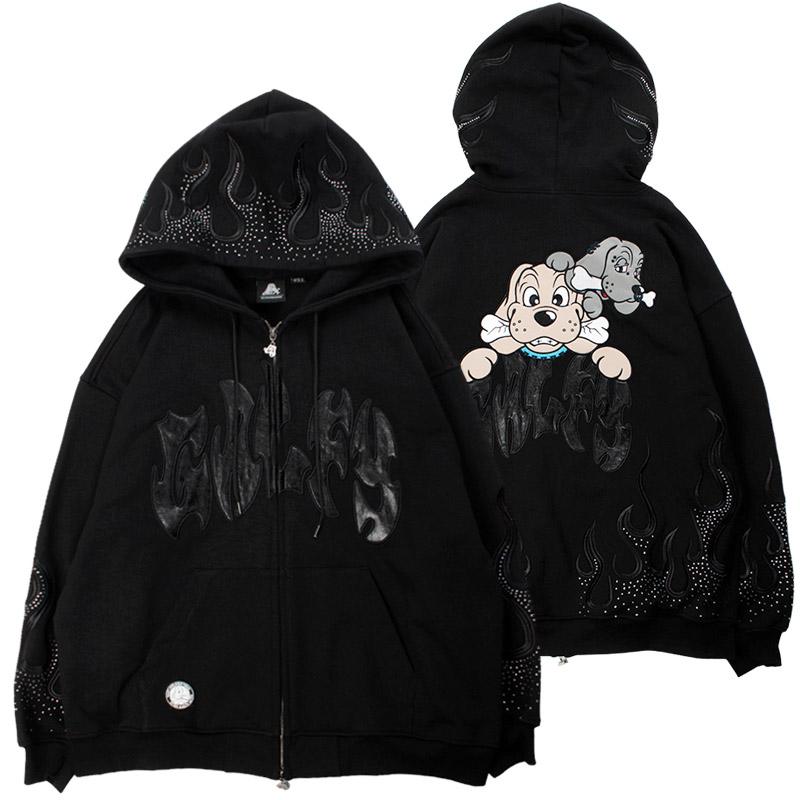 フレイム刺繍にラインストーンを配したゴージャスな仕上がりのジップパーカー。フロントにGALFYロゴ、バックにはおなじみのワンちゃんをアップリケ刺繍でオン。さらりとした風合いの裏パイル素材を使用したリラックスして着用いただけます。女性にもおすすめのユニセックスアイテムになります。