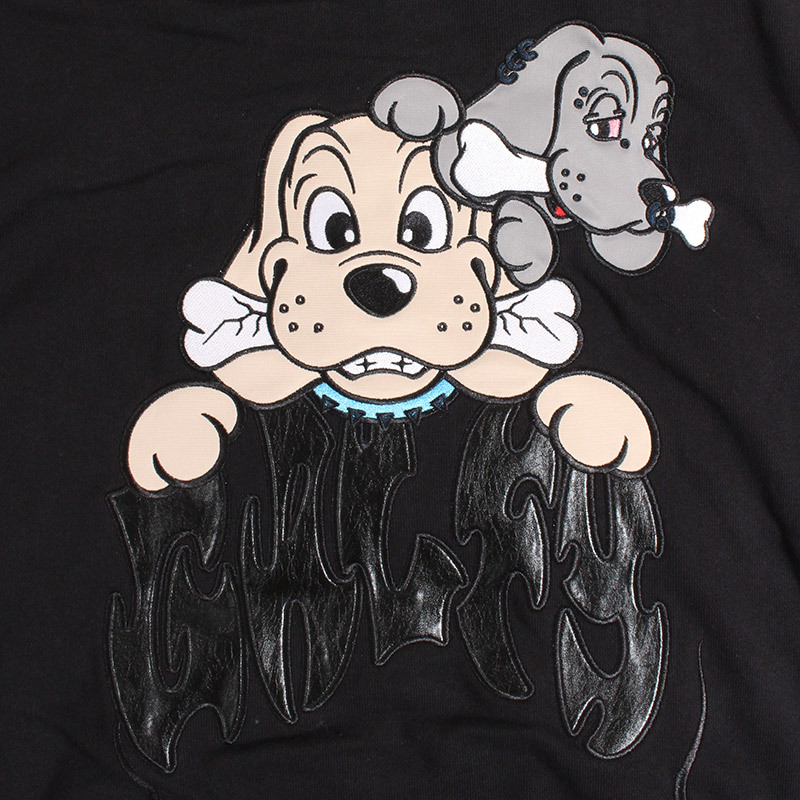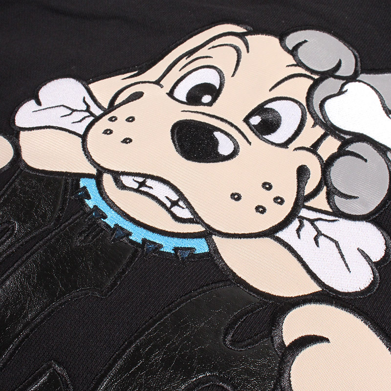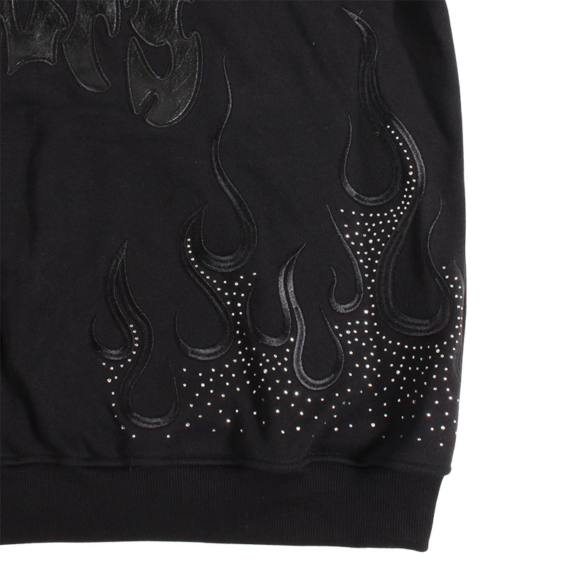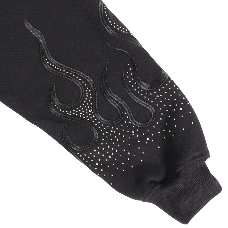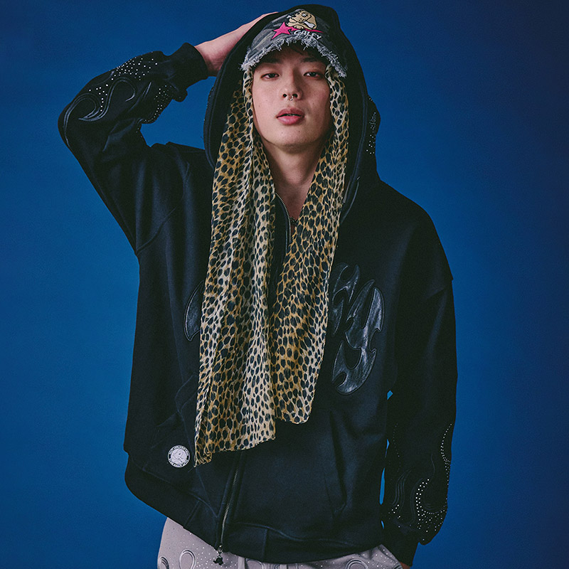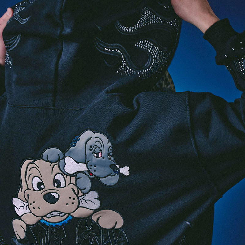 フレイム刺繍にラインストーンを配したゴージャスな仕上がりのジップパーカー。フロントにGALFYロゴ、バックにはおなじみのワンちゃんをアップリケ刺繍でオン。さらりとした風合いの裏パイル素材を使用したリラックスして着用いただけます。女性にもおすすめのユニセックスアイテムになります。