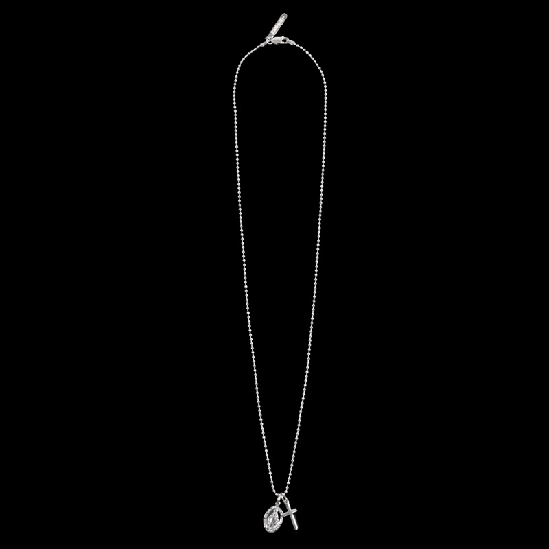 クロスとマリアのチャームを重ね着けしたシルバーネックレス。クロスとマリアのチャームがスタイリッシュなデザインでスタイリングのアクセントに大活躍するユニセックスでおすすめのアイテム。留め具には着脱のしやすいカニカンを使用。