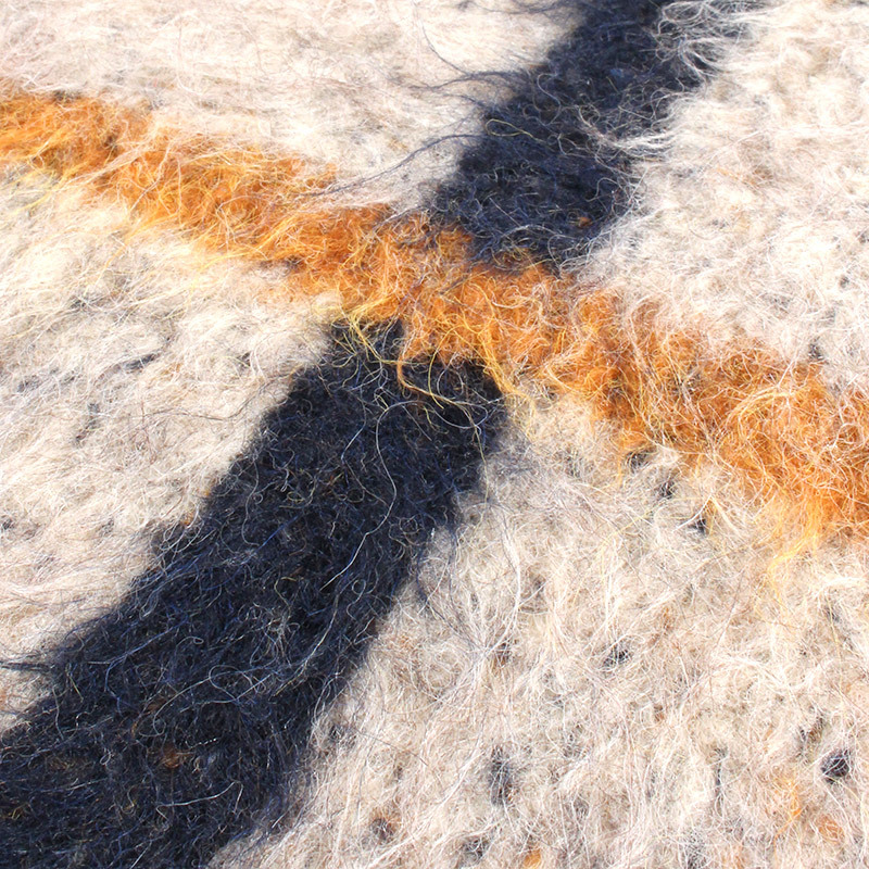 モヘアのような毛足の長い、ふんわりとした起毛感が特徴的なチェック柄のシャギーニット。しっかりとした厚みがありながらも軽やかで、肌触りもやさしい仕上がり。程よくゆったりとしたルーズシルエットで、様々なスタイリングの大活躍するアイテム。一枚でメインアイテムとして、寒い季節にはアウターのインナー使いとしても最適な一着。ノスタルジックな雰囲気漂うユニセックスでオススメニットです。
