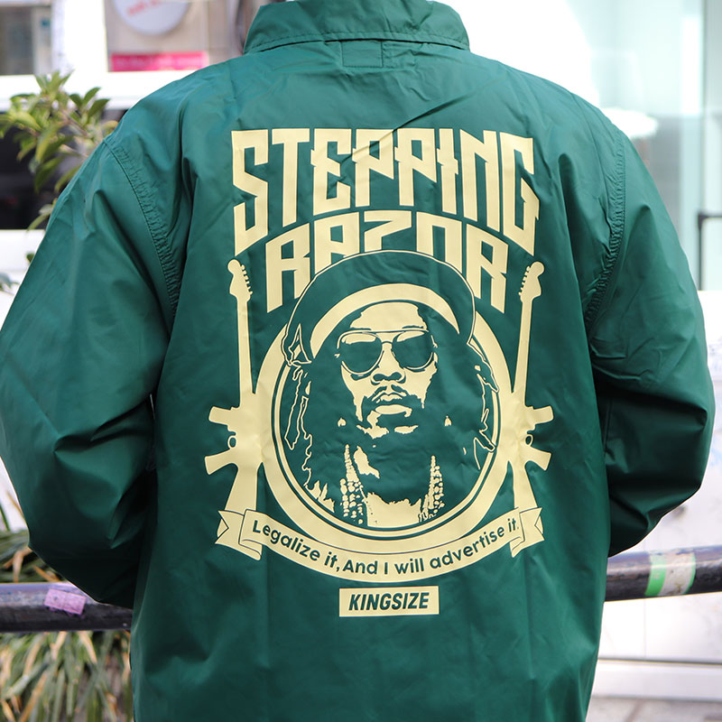 STEPPING RAZORの呼び名を持つレジェンドのグラフィックスをオンしたナイロンコーチジャケット。
