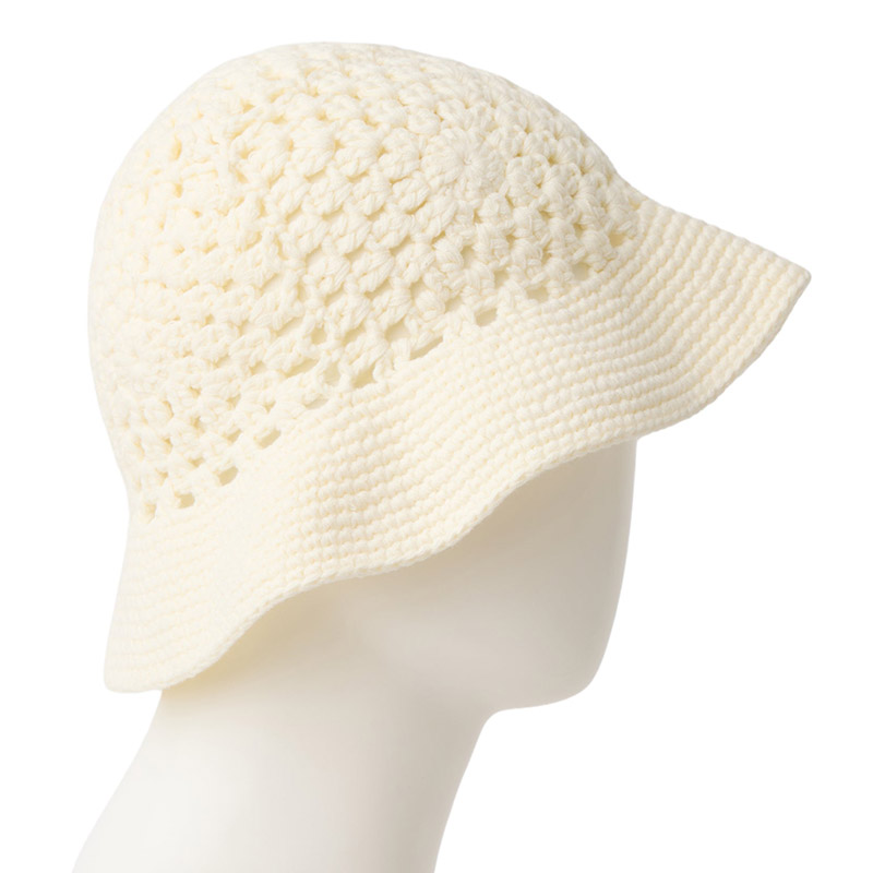クロシェ編みを採用した、柔らかな風合いが魅力のニットバケット。シンプルな単色デザインで被りやすい仕上がり。手編みならではのナチュラルな表情が、春夏のリラックスしたスタイリングにマッチ。アクリル素材を使用し、軽やかな被り心地を実現。