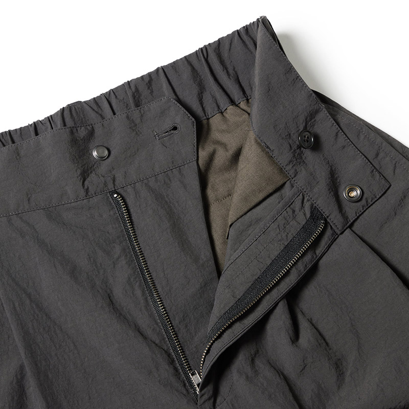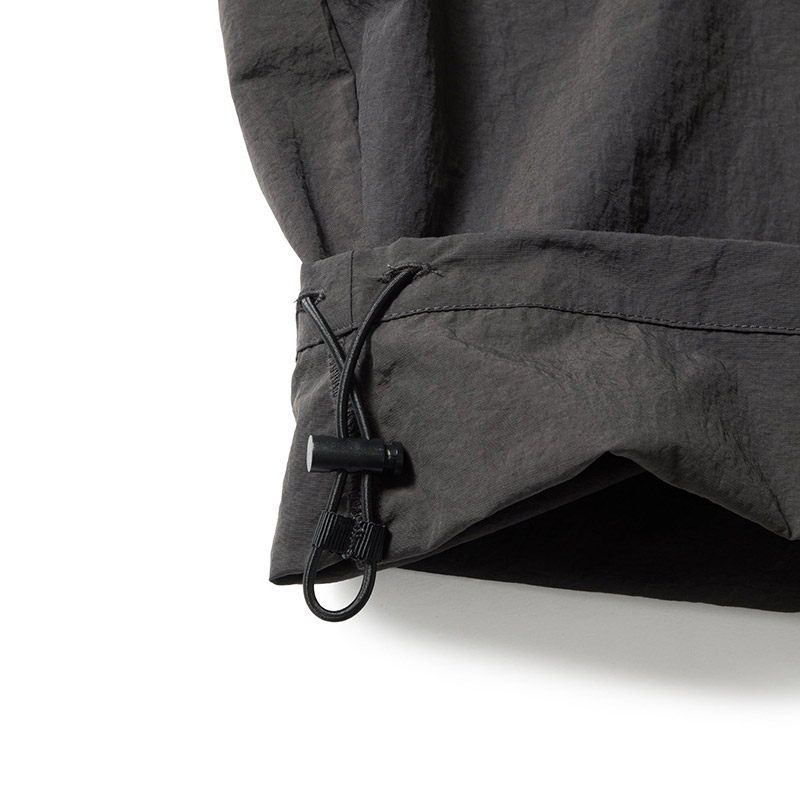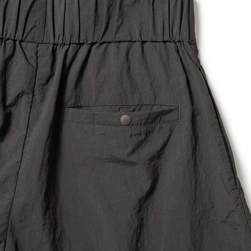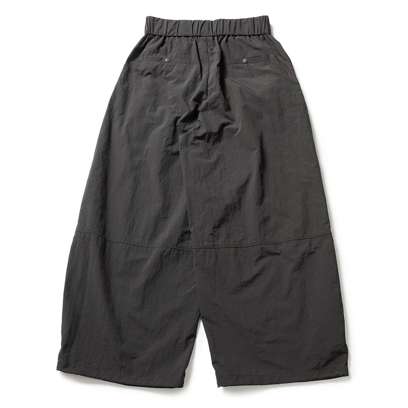 マットな質感のナイロン素材を使用し、軽さと快適性を両立。切り替えデザインにより、ワイドなコクーンシルエットを表現。裾部分のドローコードによりシルエット変更が可能。ウエストにタックを施し、立体感と程よいボリュームをプラス。スポーツからデイリーまで、幅広いシーンで活躍する1本。