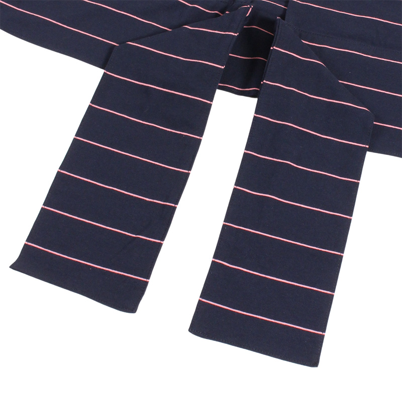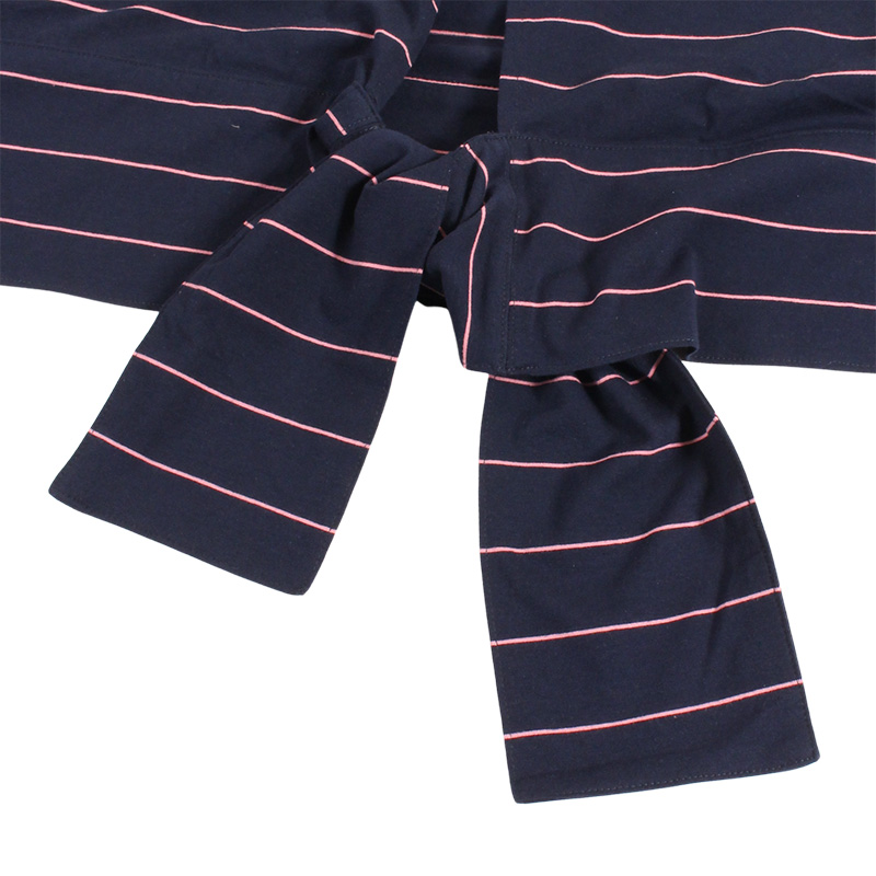 細めのピンストライプボーダーが特徴的なロンTee。胸元にボーダーカラーと同系色でグルーピーロゴを刺繍しました。後ろに大胆なスリットを入れ、裾の共地リボンをしばって着用するデザイン。好みの位置でしばれるのでボトムに合わせて丈感を調節できます。ストレッチの効いた生地でリラックスして着用でき、ルーズな印象の長め袖もポイントです。